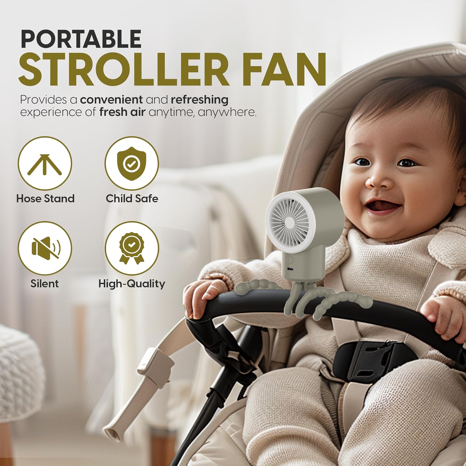 360-degree Rotating & Versatile Clip: This stroller fan clip on for baby features 360-degree rotation, both vertically and horizontally, allowing you to enjoy airflow on hot summer days. This beach fan also comes with a soft silicone tripod that enables for versatile placement on beds, cribs, strollers, and more.