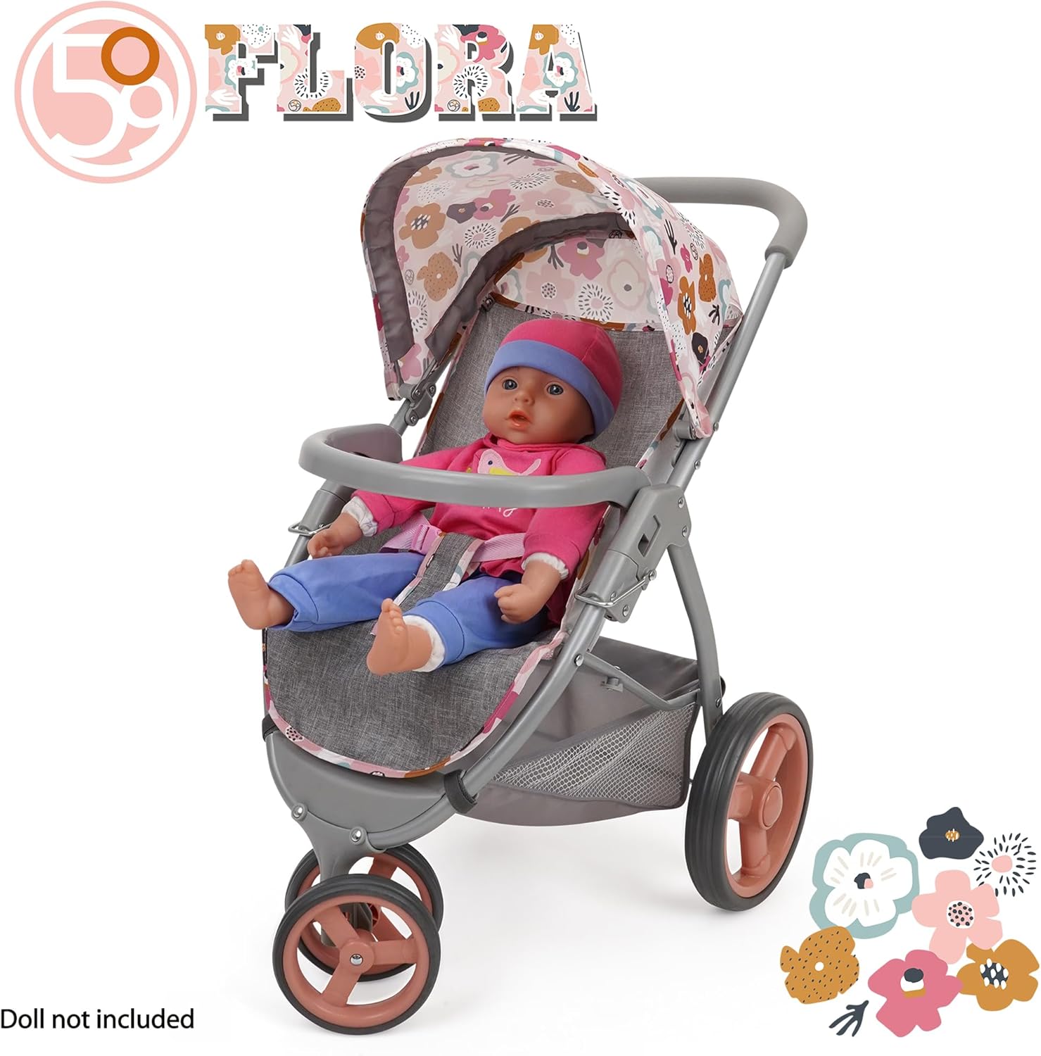 509 CREW: MELANGE FLORA – MABELLE 3-WHEEL DOLL JOGGER STROLLER – The 509 Crew Doll Jogger Stroller in Melange Flora is the ideal companion for any adventure, whether it’s jogging, walking, or simply strolling with a beloved doll or stuffed animal. This jogger-style stroller is both stylish and functional, designed to meet the needs of every little caregiver. Key features include an easy-fold mechanism for convenient storage, a spacious shopping basket, a large retractable canopy, a front bumper bar, a two-toned front swivel wheel, and large rear wheels for smooth movement. The stroller seat is equipped with an adjustable safety harness, ensuring your doll or stuffed animal stays secure during all outings. The stroller’s vibrant floral-patterned fabric is made from durable polyester, which can be hand washed for easy maintenance. REALISTIC ROLE-PLAY: Perfect for imaginative play, this doll accessory allows little parents to care for their favorite dolls and plush characters in a realistic and engaging way. SAFETY LOCK SYSTEM: Additionally, this stroller incorporates a safety lock system that prevents sudden or unexpected collapses. To fold it for storage or travel, both side safety latches must be lifted, providing an extra layer of security. Suitable for dolls up to 24″ (60 cm). ***Doll not included.*** Suitable for girls & boys ages 3 and up.