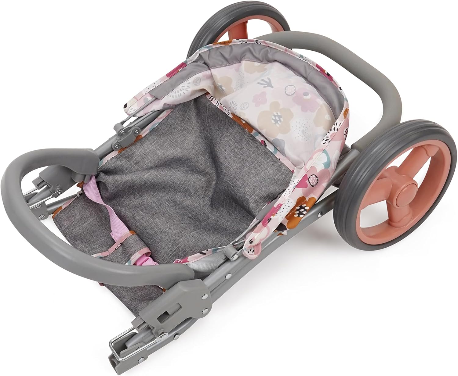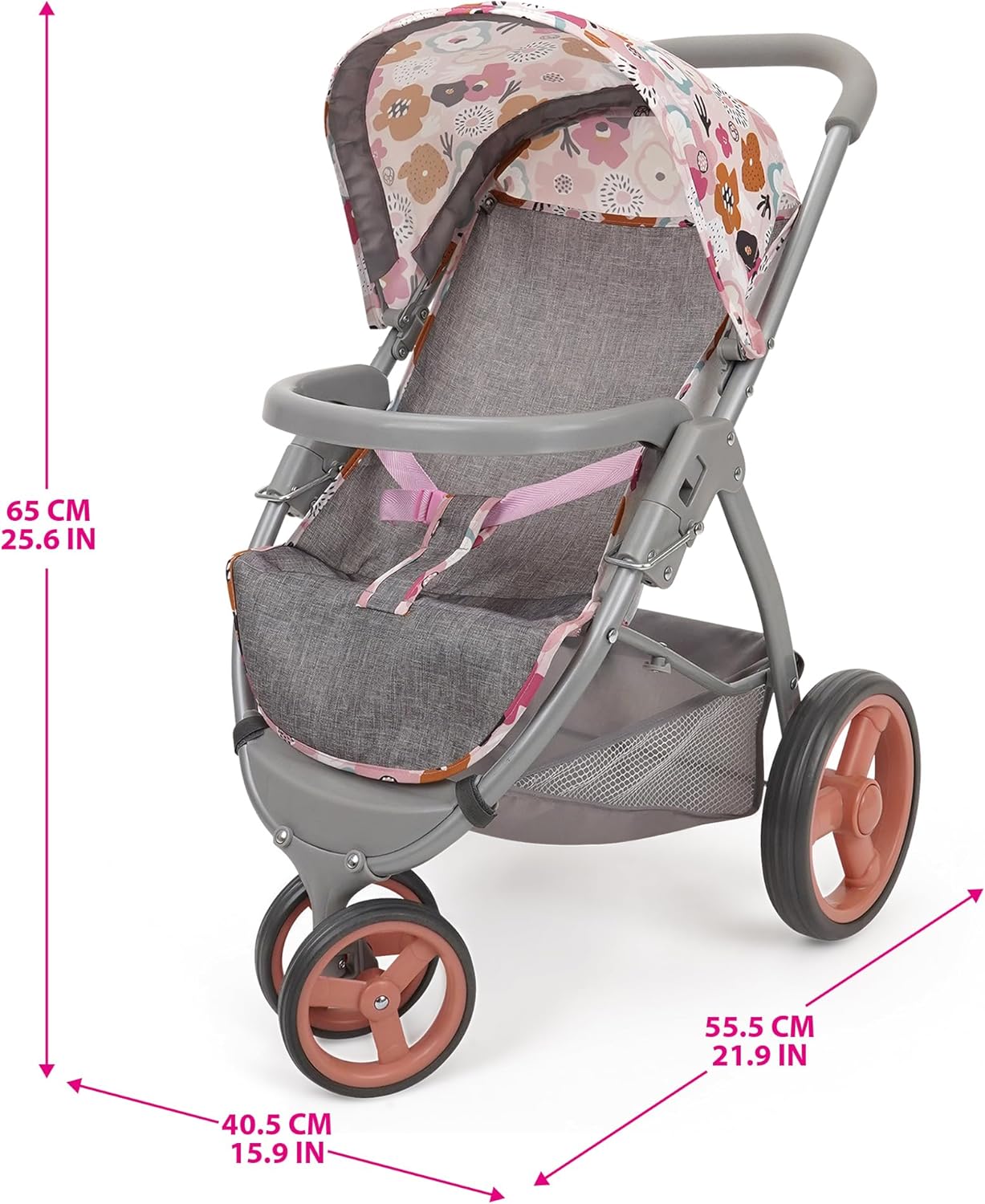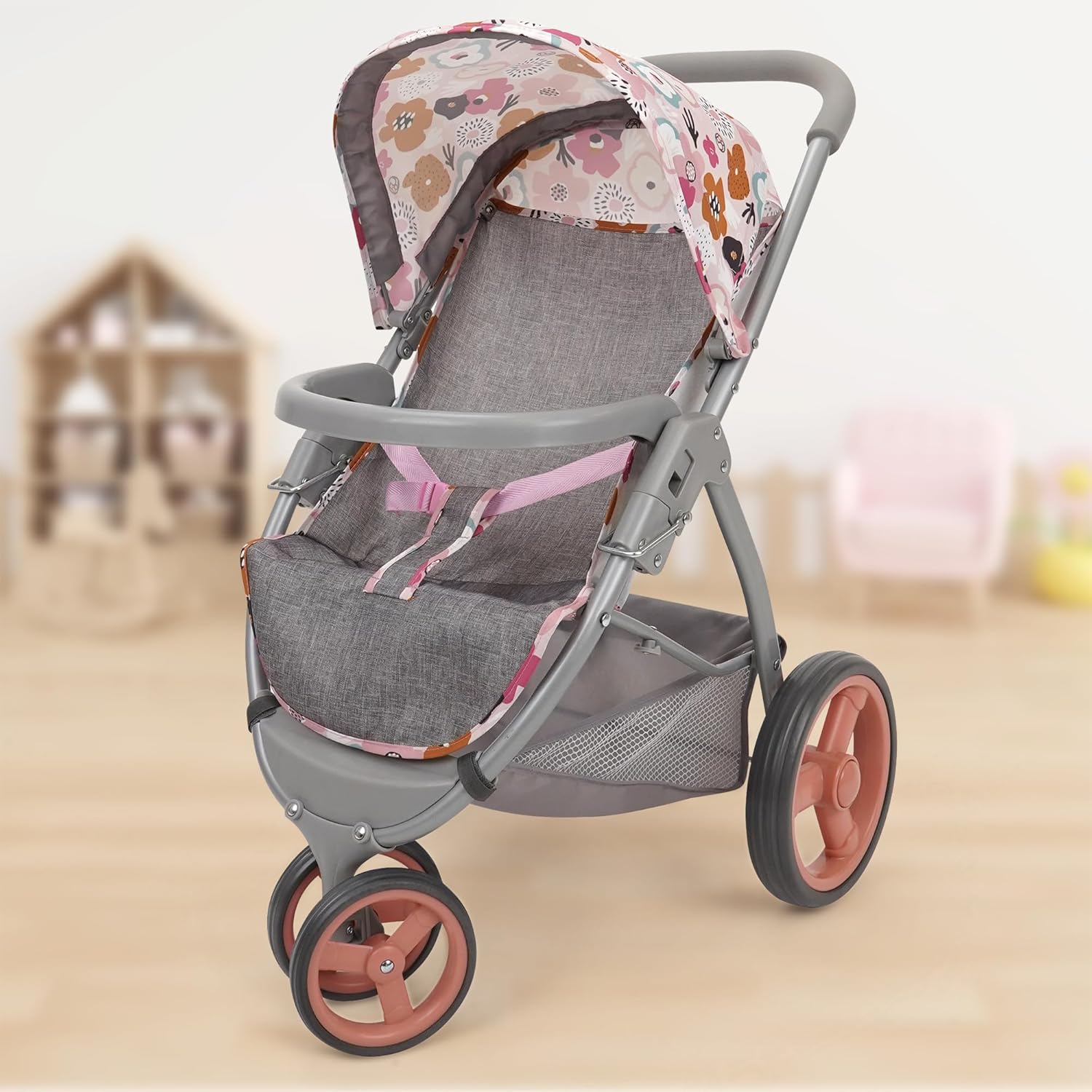VERSATILE DESIGN: Perfect for jogging, walking, or strolling, the jogger-style stroller is both stylish and functional for any adventure with dolls or stuffed animals. Heathered grey, flowers, cream, pink & orange coloring.