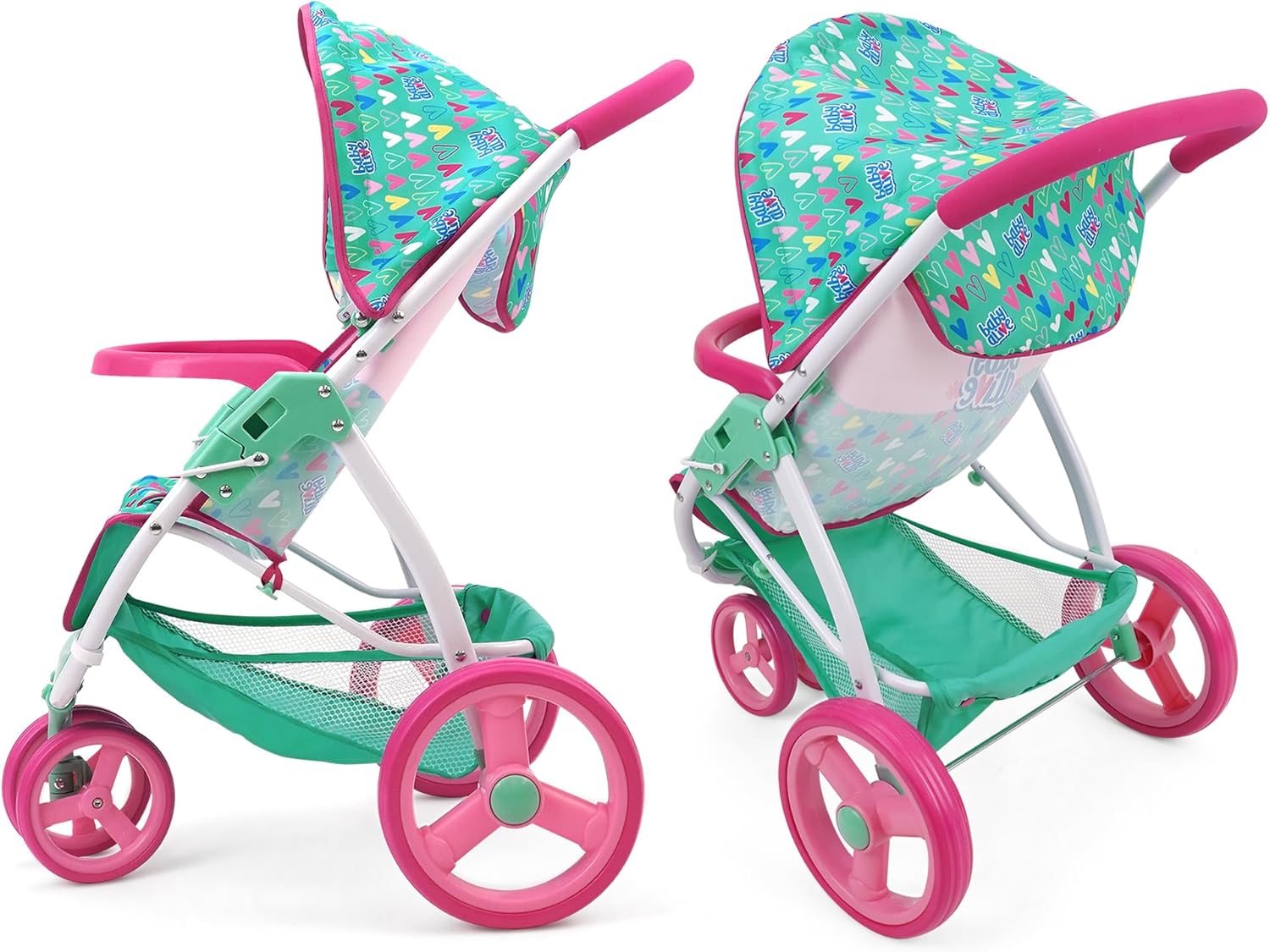BABY ALIVE: DOLL JOGGING STROLLER – GREEN, PINK, HEARTS – Baby Alive Doll Jogging Stroller is the perfect stroller for everyone’s lifestyle whether you enjoy jogging, walking or strolling with your favorite stuffed animal or doll. The jogger style doll stroller is a stylish yet functional. Stroller folds easy for storage, includes shopping basket, large retractable canopy, front bumper bar, two toned front swivel wheel and large rear wheels. Stroller seat has an adjustable safety harness to keep your favorite doll or stuffed animal safe and secure. The stroller’s fun bright fabric with Baby Alive pattern is a durable polyester which can be hand washed. stroller folds easy for storage and traveling. This Baby Alive Doll Jogging Stroller also includes a safety lock system that prevents a sudden or unexpected collapse, both side safety latches have to be lifted in order to fold for storage or travel. Play & Develop – Provides opportunities for nurturing roleplaying & engaged creativity. Little mommy’s and daddy’s can practice caretaking skills all while creating their own stories. The perfect doll accessory. PRODUCT DIMENSIONS: 21.9″(L) x 15″(W) x 25.6″ (H). For doll up to 24″ (60cm). **Doll Not Included.** Suitable for girls & boys ages 3 and up.