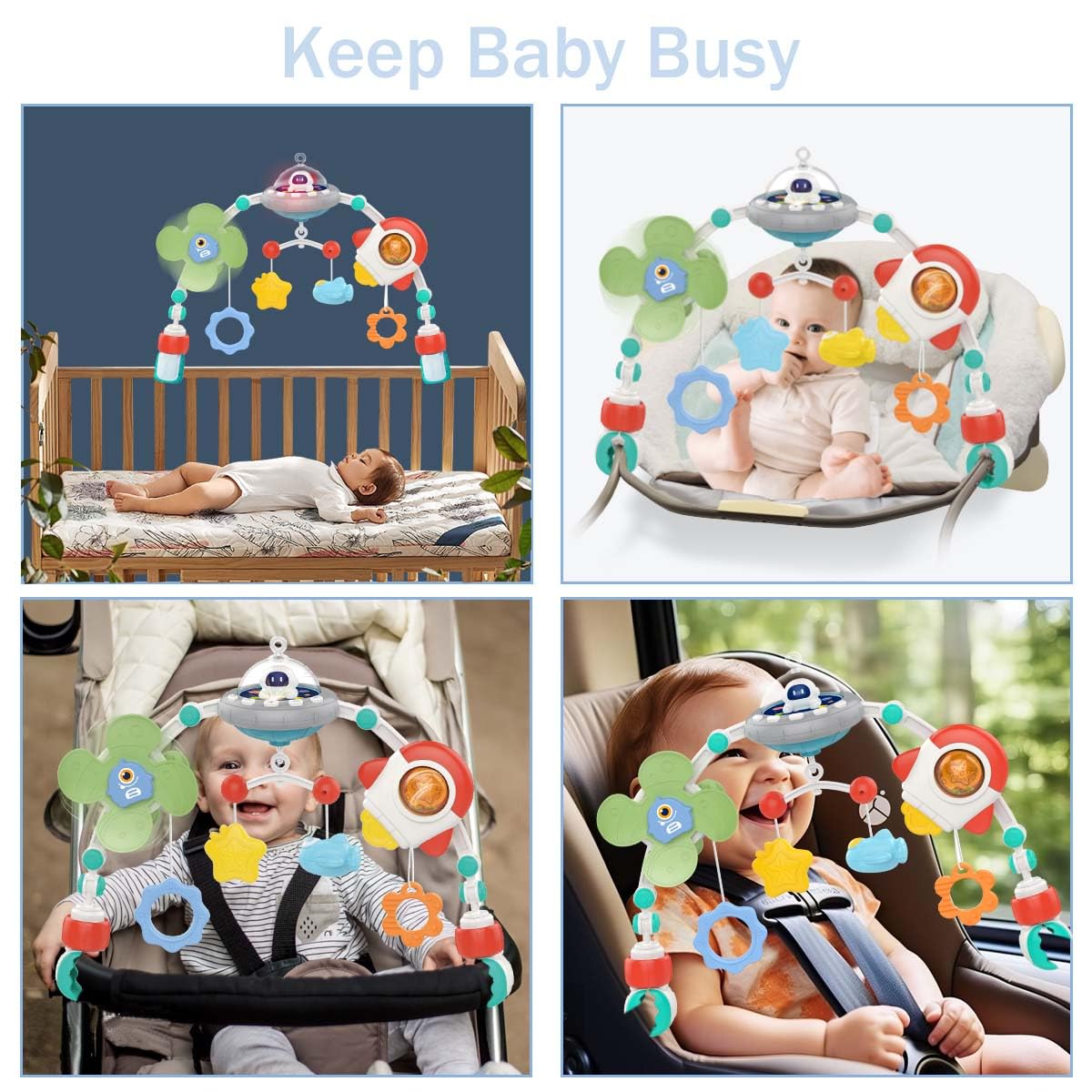 【Musical & Light Play Arch Toy】This baby stroller toy has a space music box, play soft music and projector, also can be a night light. 360° Rotation to accompanies baby to sleep.