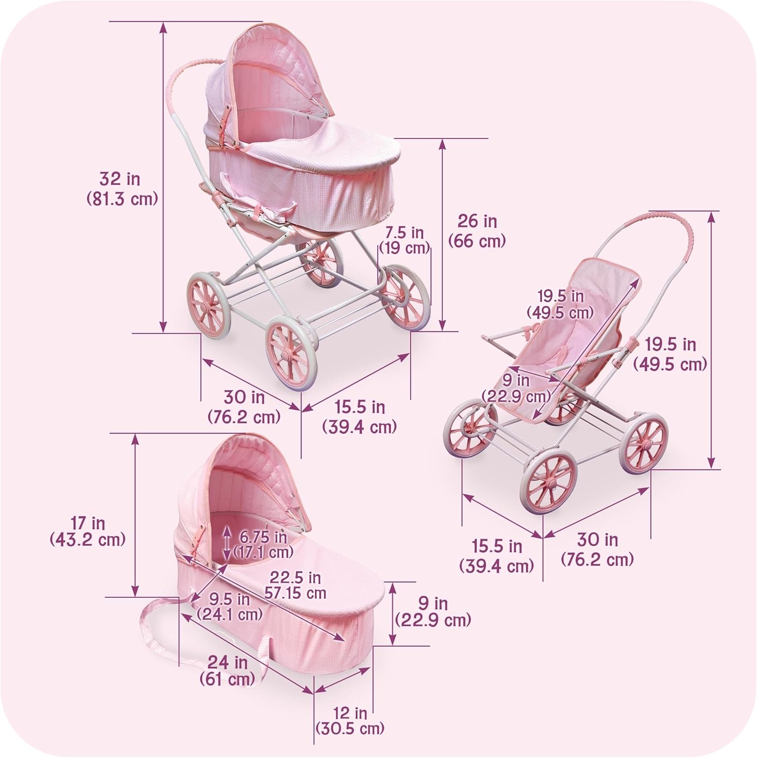 Badger Basket’s exciting Just Like Mommy 3-in-1 Doll Pram includes a fancy doll carriage, a doll stroller, and a doll carrier with carrying handles all in one! Your child can push or carry her baby doll everywhere in comfort and style. Change the look on the fly – no tools needed to convert from one style to another. The three, fun configurations, and additional realistic features, offer extra play value and numerous opportunities for your child to make thoughtful baby care decisions during play. Use the carrier and stroller separately for different baby dolls. Carrier can be attached to the frame so that the pram faces forward or back. Carrier also includes a fabric cover, interior padding, and adjustable canopy. Adjustable stroller seat with three-point harness. Rubber grip on the stroller/pram handle. Stroller frame easily folds down. Made with fabric, PP plastic, EVA wheel tread, metal tubing, PVC-free synthetic rubber, and MDF. For dolls up to 22 inches. Fits 18 inch dolls such as American Girl, My Life As, Madame Alexander, and Our Generation; and also fits 15 inch American Girl Bitty Baby dolls and 14.5 inch American Girl WellieWishers dolls. Overall pram measures approximately 30 inches L x 15.5 inches W x 32 inches H. Wheels: 7.5 inches diameter. Height from floor to top of handle: 26 inches H. Carrier: 24 inches L x 12 inches W x 9 inches H (7 inches H not including folded hood, 17 inches H with hood up). Interior of the carrier: 22.5 inches L x 9.5 inches W x 6.75 inches H. Stroller: 30 inches L x 15.5 inches W x 26 inches H. Interior of stroller seat: 9 inches W x 19.5 inches H. Wipe and spot clean as needed. For children from three years old and up. This item is a toy only. Adult assembly required. /!\ WARNING: CHOKING HAZARD – Small parts. Not for children under 3 yrs. Doll not included. Product may vary slightly from shown. Props shown are for illustration only and are not included. Item ships in its original carton which may include a product photo.