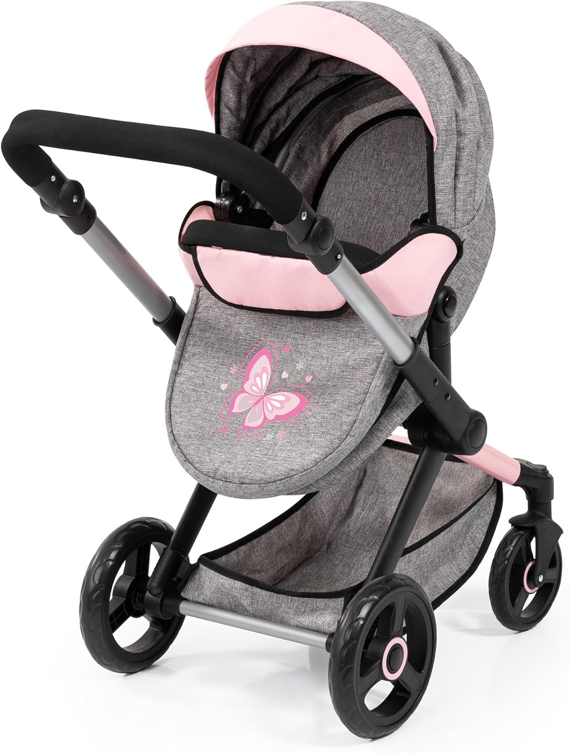 BAYER DESIGN DOLLS: XEO MEGA 10 PIECE SET – GREY, PINK, FAIRY – This big doll’s pram set consists out of a doll’s pram, a bed, a sleeping bag and plastic accessories. The combi doll’s pram XEO has a modern design and is suitable for dolls up to 46 cm / 18 inch. With its adjustable handle, this doll’s pram is easily adaptable to your child’s height; also, it’s possible to attach the carrycot in direction of travel or towards your child. With the reversible handle a change of the direction is also possible. The doll’s pram can be easily converted to a pushchair with press buttons and with the change of the angle of the carrycot. The swivel front wheels assure a stable cornering. The accompanying bag fits perfect to the color combination of the doll’s pram. To put the doll to sleep, the set includes a sleeping bag and a bed. Thanks to the bottle, pacifier and cutlery the baby doll can be comforted. ENCOURAGE PRETEND PLAY: Play & Develop – Provides opportunities for nurturing roleplaying & engaged creativity. Little mommy’s and daddy’s can practice caretaking skills all while creating their own stories. The perfect doll accessory. INCLUDES: 1 Dolls Pram, 1 Shoulder Bag, 1 Bed, 1 Sleeping Bag, 1 Pacifier, 1 Bottle, 1 Plate, 1 Spoon, 1 Fork, 1 Knife. Designed for dolls up 18″ (46cm) * Doll not included. Suitable for boys and girls ages 3 and up.