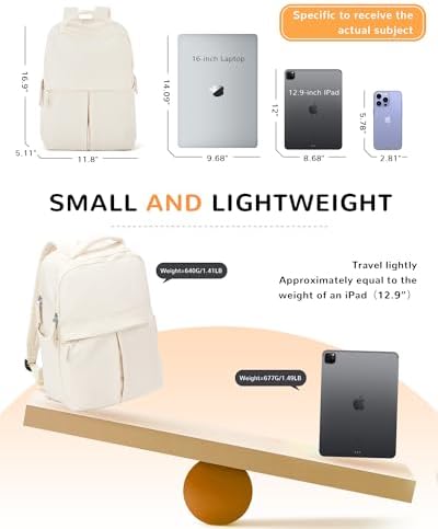 [Dimensions & Weight] Compact and beautifully aesthetic backpack but with a large capacity. Size=(H)43cm/16.9″*(L)30cm/11.8″*(W)13cm/5.11″. Weight = 640G/1.41LB, equivalent to the weight of a 12.9″ iPad.