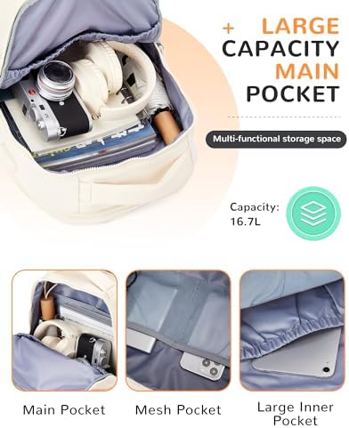 [Multi-Pocket Design] This carry on backpack has a capacity of about 16.7 L. The backpack has a total of four zippered pockets (front pocket, main pocket, computer pocket, anti-theft pocket) and two side pockets. There are two mesh pockets and a large insert pocket in the main pocket. You can store personal belongings such as clothes, textbooks, headphones, water cups and umbrellas.This travel bag is great for short personal trips of 1-2 days.