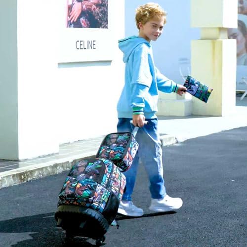 【HIGH COST-EFFECTIVE 3PC】- Kids rolling backpack with lunch bag & pen case, wheeled backpack has a dual purpose for backpack and suitcase. Sturdy retractable T-handle is height adjustable with ergonomic grip to make the wheeled backpack durable.