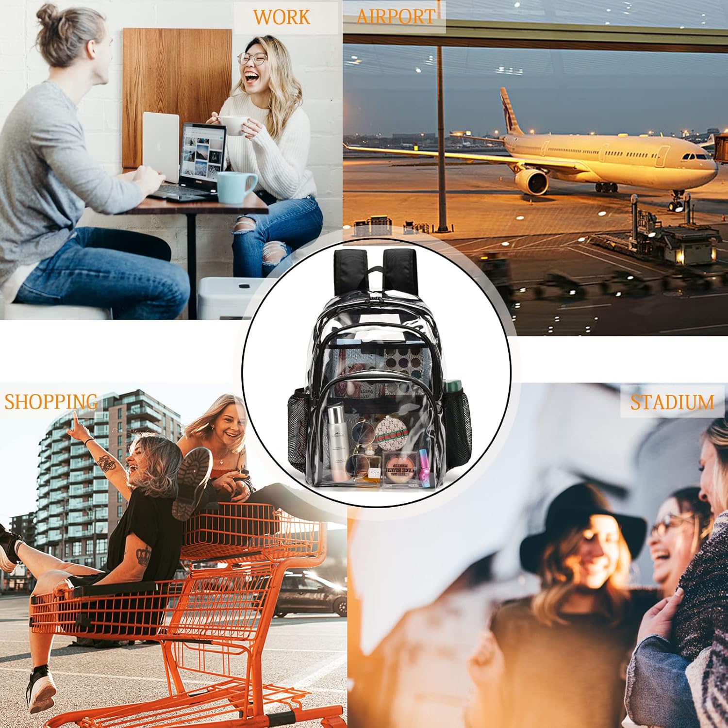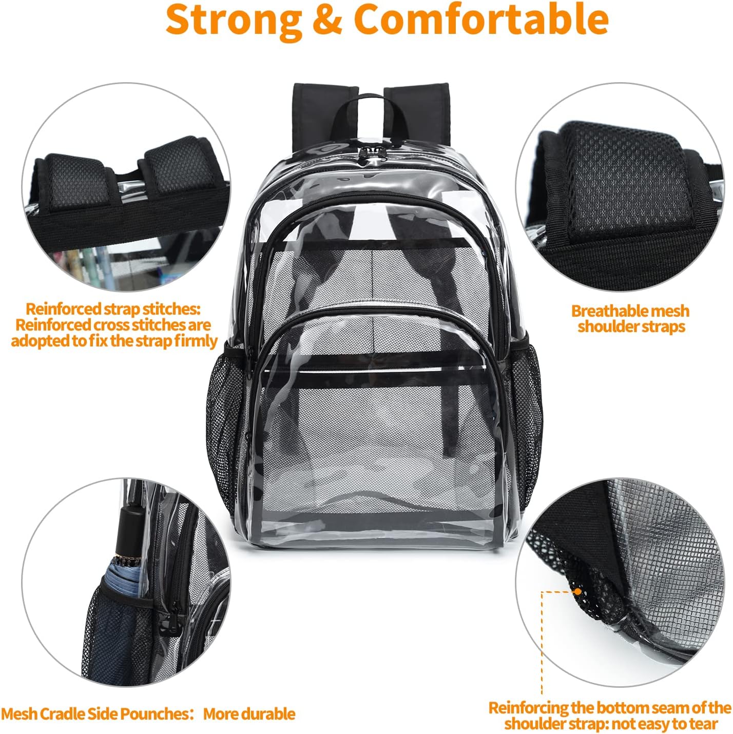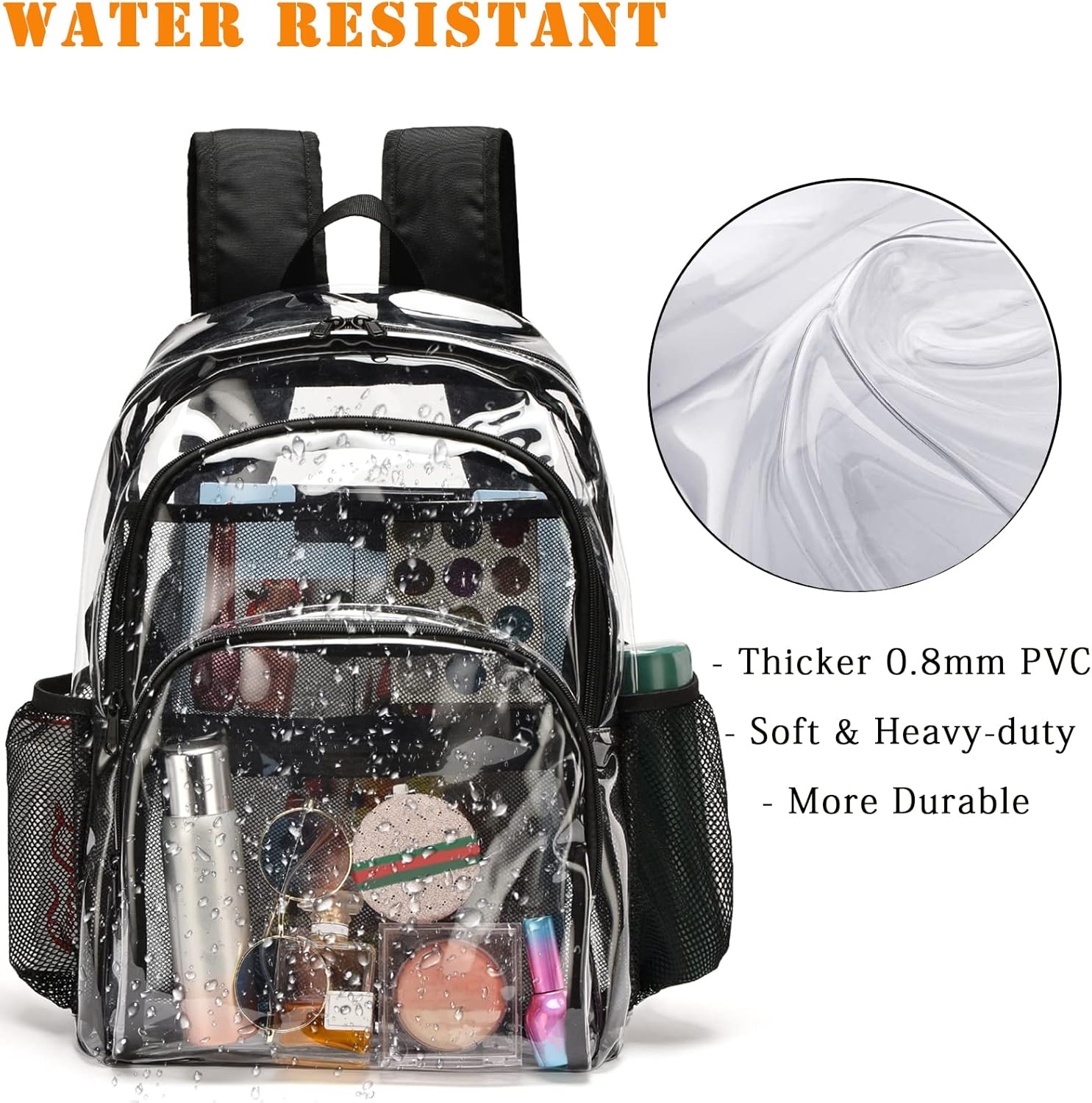 Clear backpack heavy duty:KUI WAN clear backpack bag is made of 0.8mm heavy-duty transparent PVC materials, and all seams are reinforced with double stitches which makes them avoid tearing and hold heavy loads easily. Transparent large clear-view allows quick inspection for safety purpose