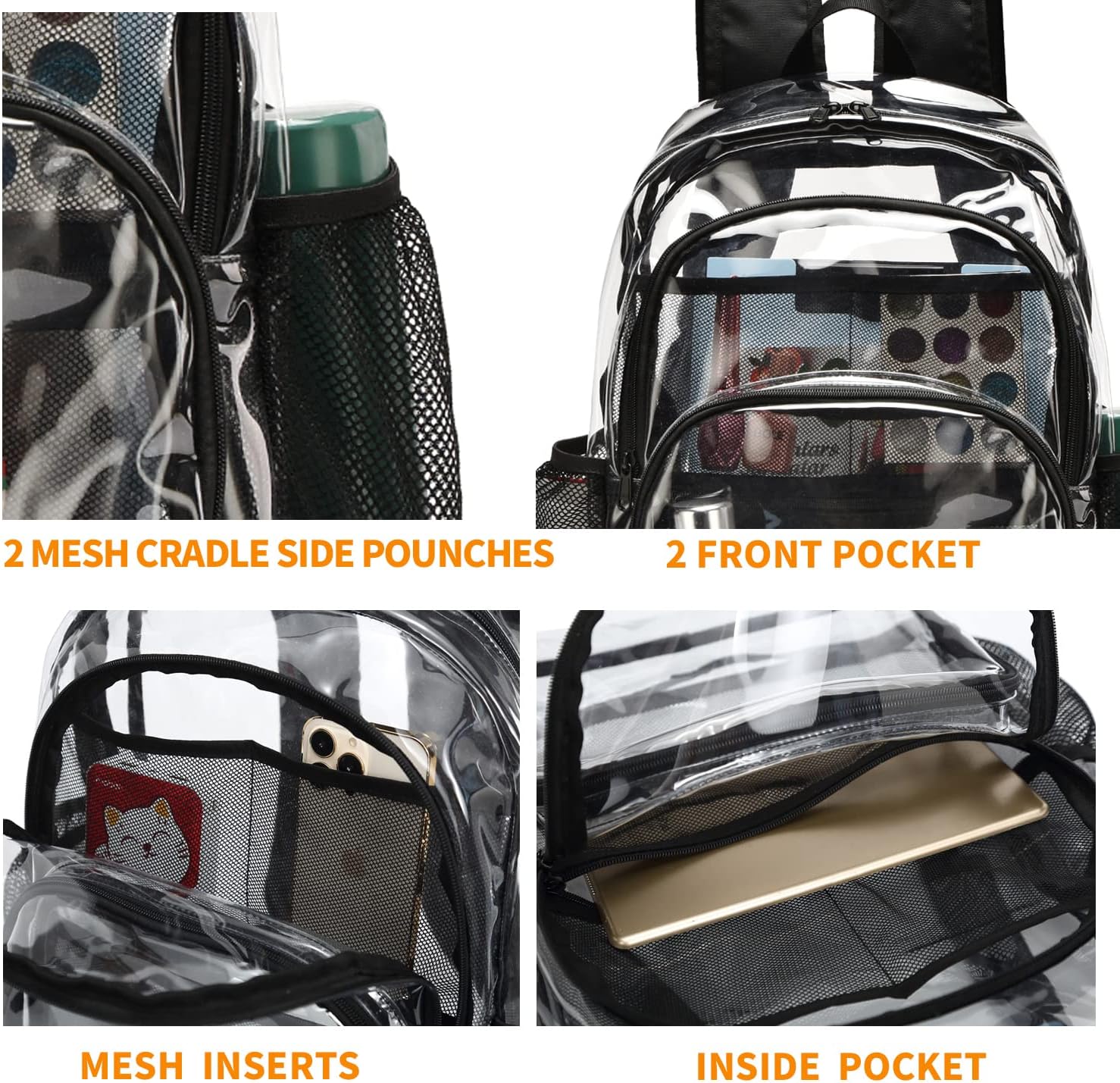 Multi-functional compartments & large capacity:Size:17 x 12 x 7.5inches (H x L x W);1 large main double zipper compartment for binders,laptops,books,etc.;2 front single zipper compartment for notepads;glasses;etc.;the firs single zipper compartment,which have 1 big mesh slots with single zipper for phone;cash;cards;etc.;and 2 small open mesh slots for pens;tissues;keys;etc.;2 side mesh pouches for water bottles or folding umbrellas.The clear backpack affords decent room for different purposes