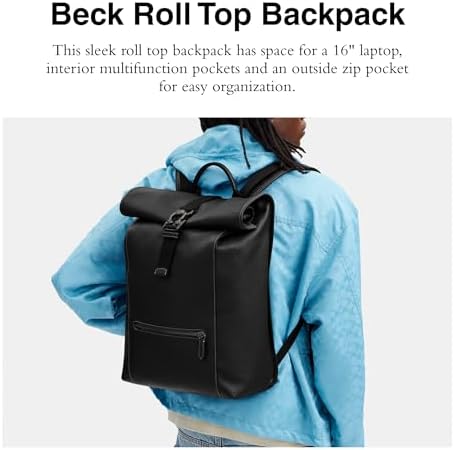 Editors Notes: Always on call, our Beck is a sophisticated sporty choice for every day. Crafted of soft polished pebble leather, this sleek roll top backpack with laptop sleeve has interior multifunction pockets and an outside zip pocket for easy organization