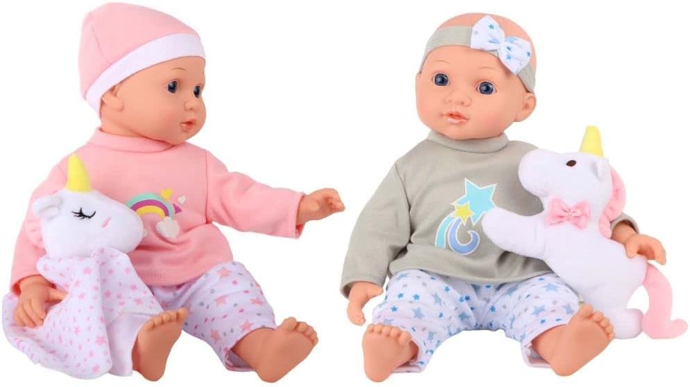 DREAM COLLECTION: TWINS DOLL SET: These beautiful baby dolls from the Dream Collection will ignite your little one’s imagination and bring endless hours of creative pretend play. Dressed in adorable outfits, these realistic-looking baby doll twins are perfect for creating special memories. Made from high-quality eco-friendly materials that are resistant to moisture, strong and durable, these 14’’ soft body dolls come in an attractive gift box, making it the ideal present for birthdays or Christmas. Perfect for learning to nurture and love with their first friend. – your little one will adore dressing her up, feeding her, and rocking her to sleep! Suitable for kids aged 2 years and older, it’s sure to create special memories that will last a lifetime.