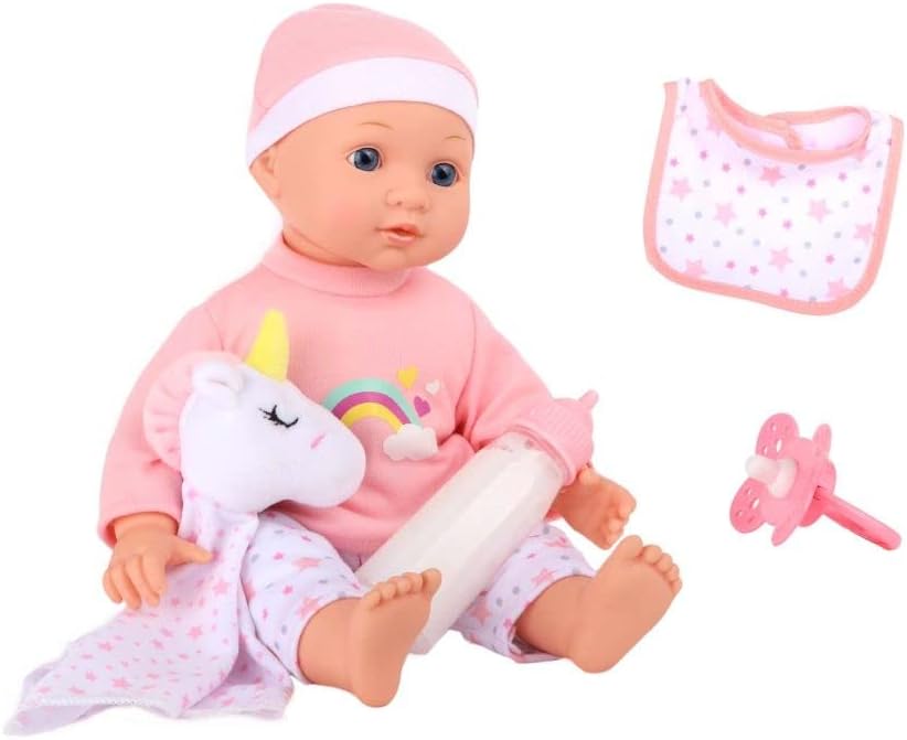 Soft body doll with vinyl head and hand, and with pacifier, bib, magic milk bottle, plush animal and comforter.