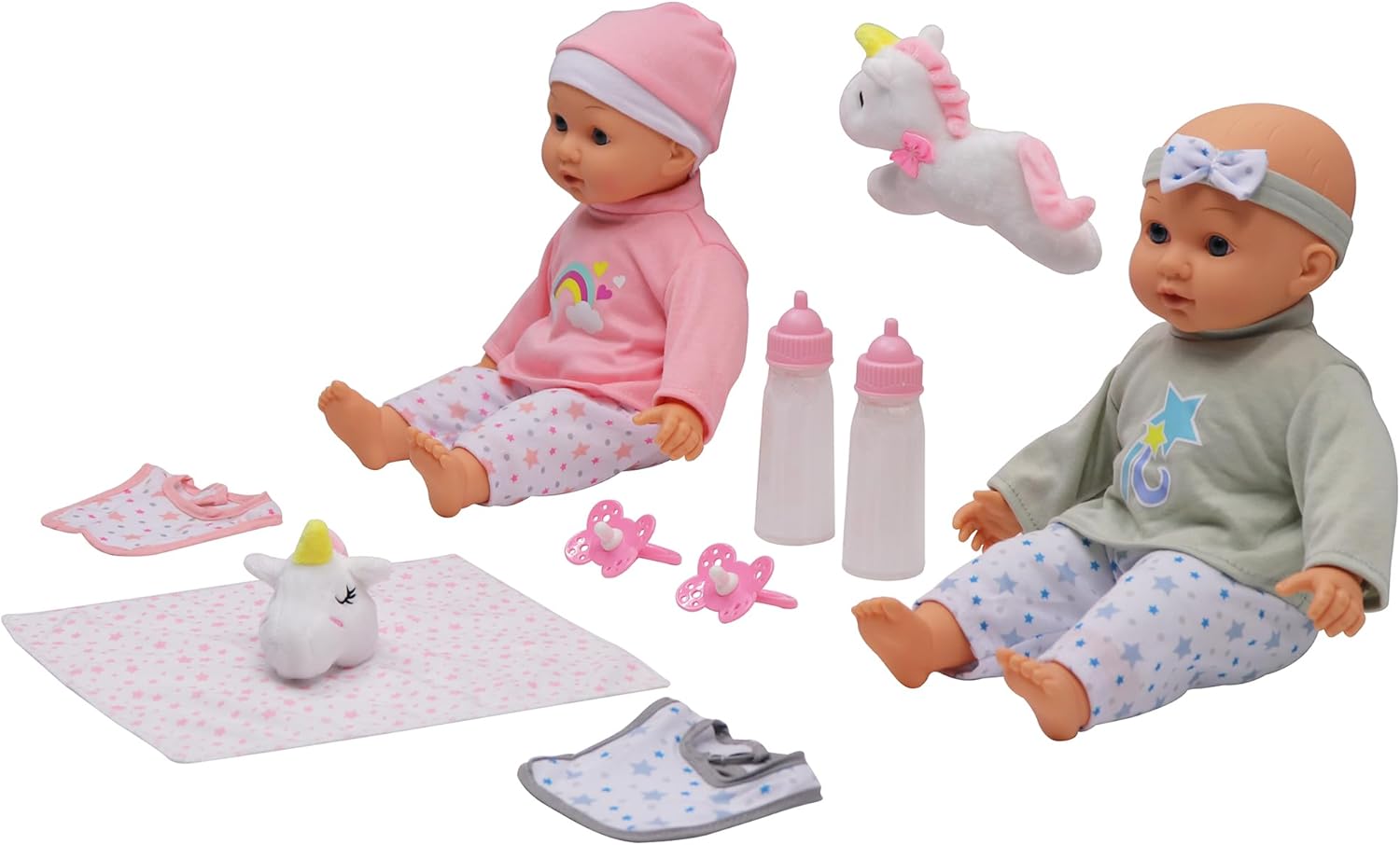 DREAM COLLECTION: TWINS DOLL SET: These beautiful baby dolls from the Dream Collection will ignite your little one’s imagination and bring endless hours of creative pretend play. Dressed in adorable outfits, these realistic-looking baby doll twins are perfect for creating special memories. Made from high-quality eco-friendly materials that are resistant to moisture, strong and durable, these 14’’ soft body dolls come in an attractive gift box, making it the ideal present for birthdays or Christmas. Perfect for learning to nurture and love with their first friend. – your little one will adore dressing her up, feeding her, and rocking her to sleep! Suitable for kids aged 2 years and older, it’s sure to create special memories that will last a lifetime.