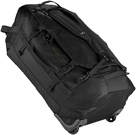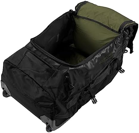 ROLLING DUFFLE BAG with wheels featuring treads, bumpers, and heavy-duty housing to keep the load rolling with minimal effort