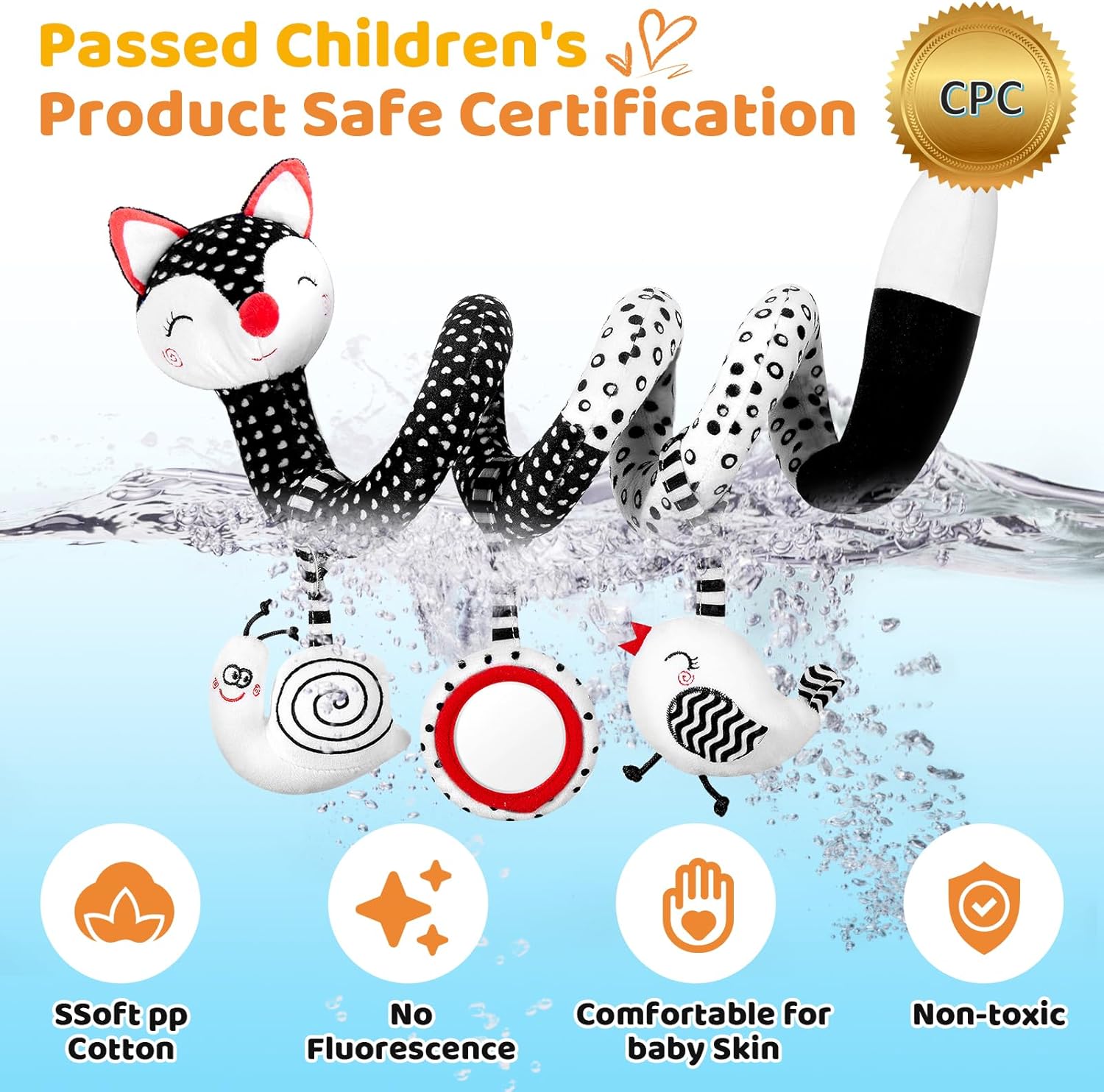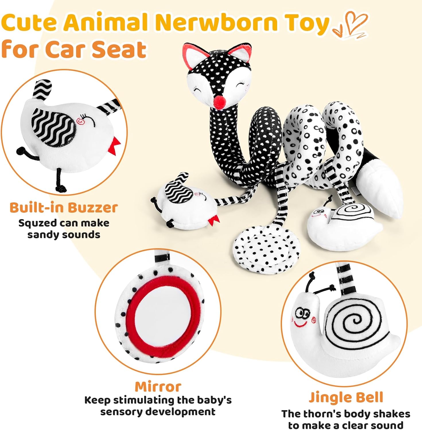 Multi-sensory Spiral Car Seat Toys: Our Spiral Plush baby toy is designed with cute animal patterns, which can spiral easily on the car seat, stroller bar, crib rails, baby gym, baby carrier, shopping cart handles, etc. give your children a funny amusement and interaction when they are out or bored. They will be attracted and have fun playing with the cute car seat toys anywhere.