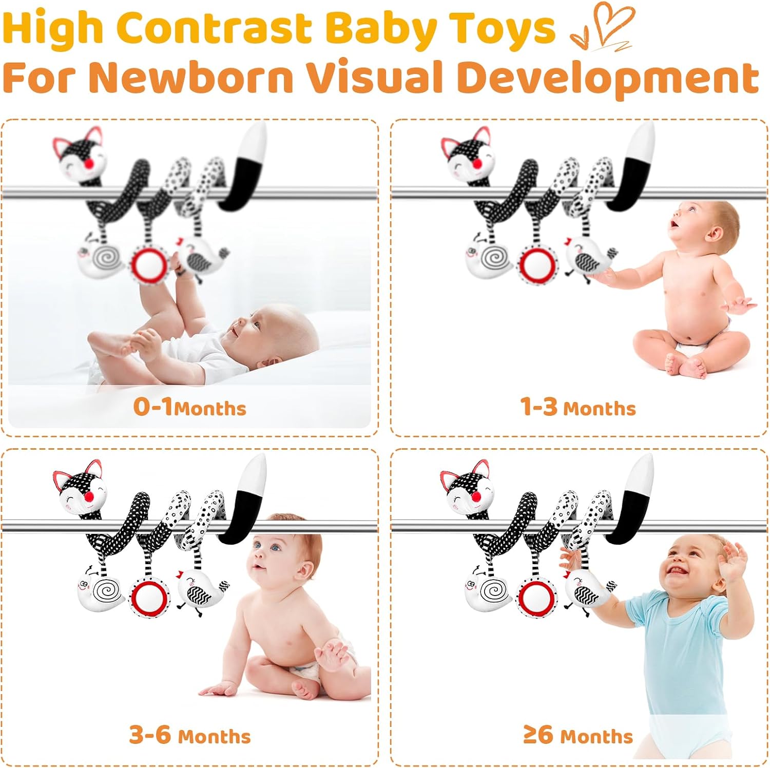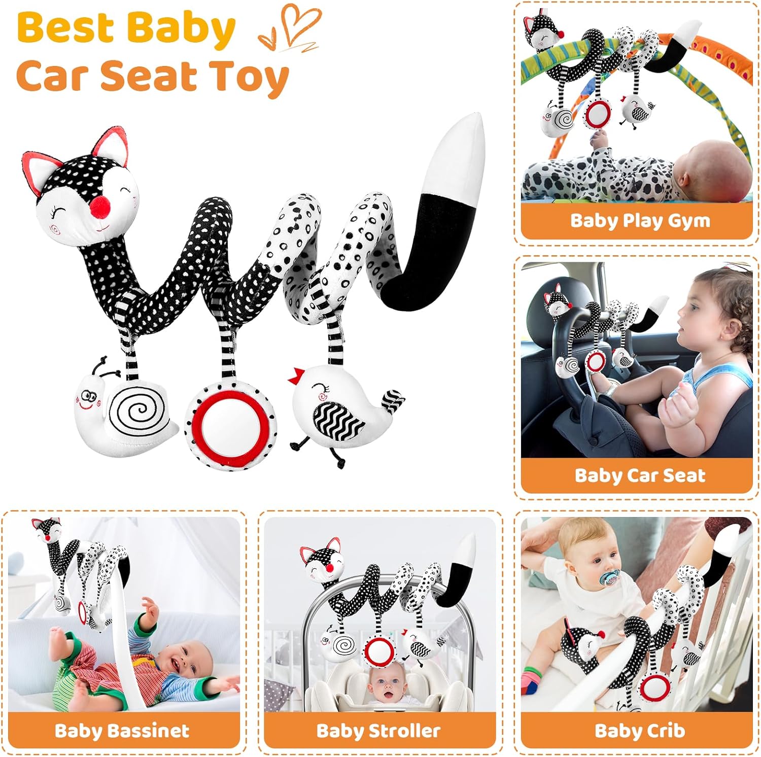 Carseat Toys for Infants 0-6 Months: The car seat toys are designed with different patterns, and carseat toys have 3 hanging parts which are a rattle, baby mirror, and BB device. Easily spiral on car seats, stroller bars, crib rails, baby gym, baby carrier, shopping cart handles, etc. to give your child fun amusement, and interaction when they are bored or out of sorts, they will be attracted and have fun playing with the cute stroller toys anywhere.