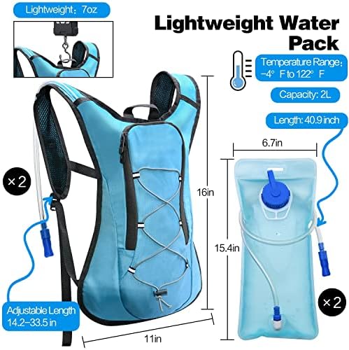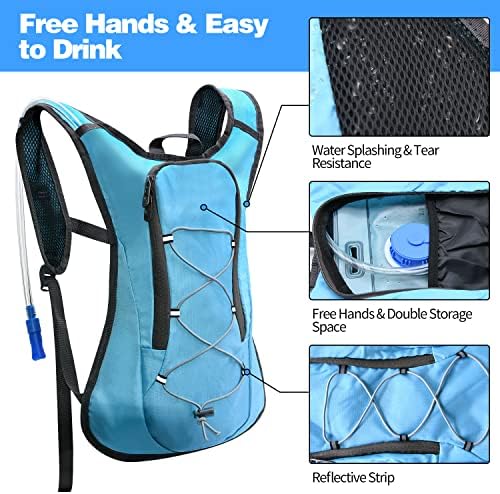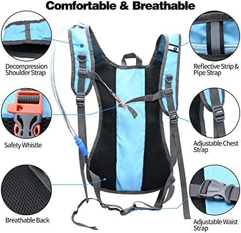 【Lightweight & Durable】- Super lightweight hydration backpack with 2L water bladder and adjustable wide shoulder strap can reduce your back and shoulder pressure. Splash resistant nylon material can protect your belongings from staying dry in light rain, and its double built-in waist straps improve its wear and tear resistance to ensure the pack’s life lasts longer.