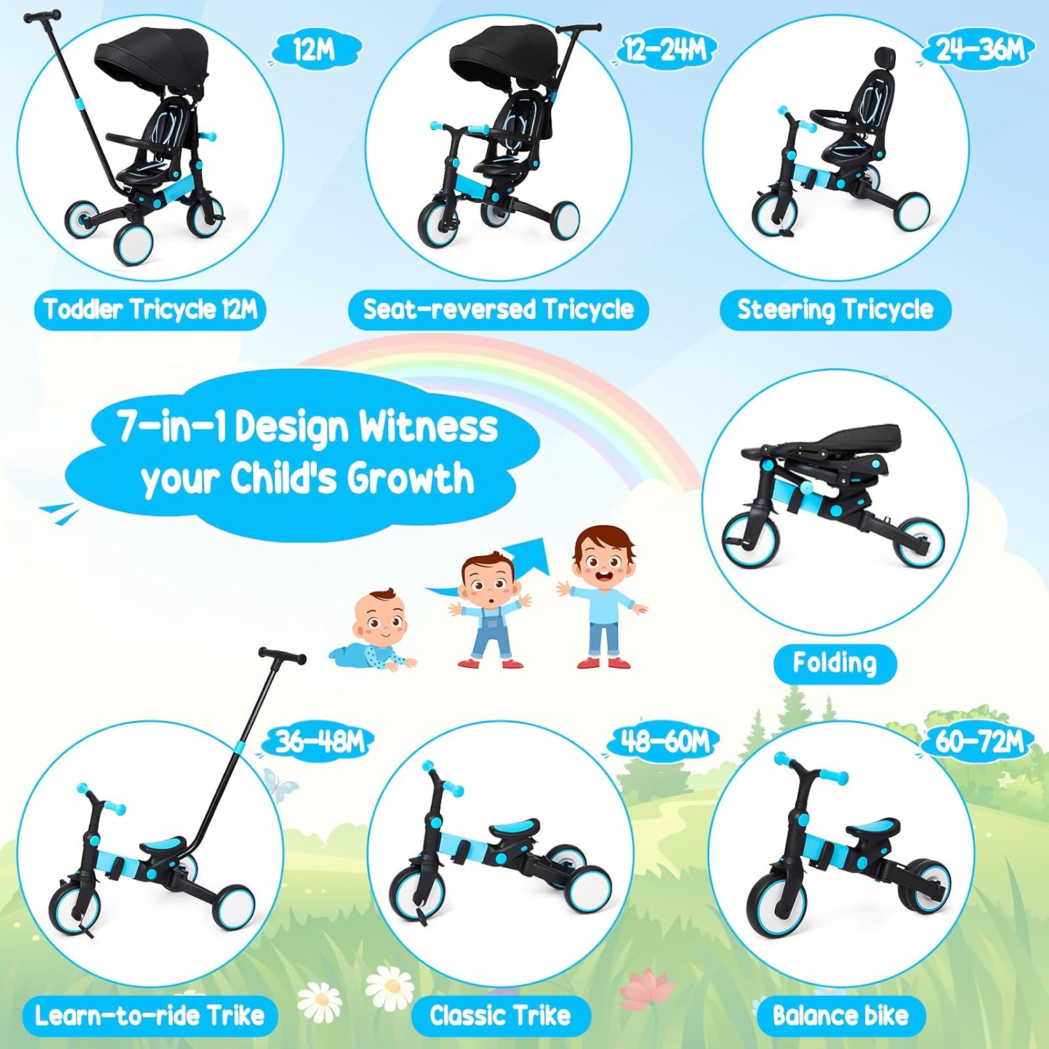 【7-in-1 Multifunctional】This baby tricycle can be used as a learn-to-ride trike with a canopy, a push tricycle, a standard tricycle, and a balance bike, which meets the needs of children at different stages of growth from 1 to 6 years old.