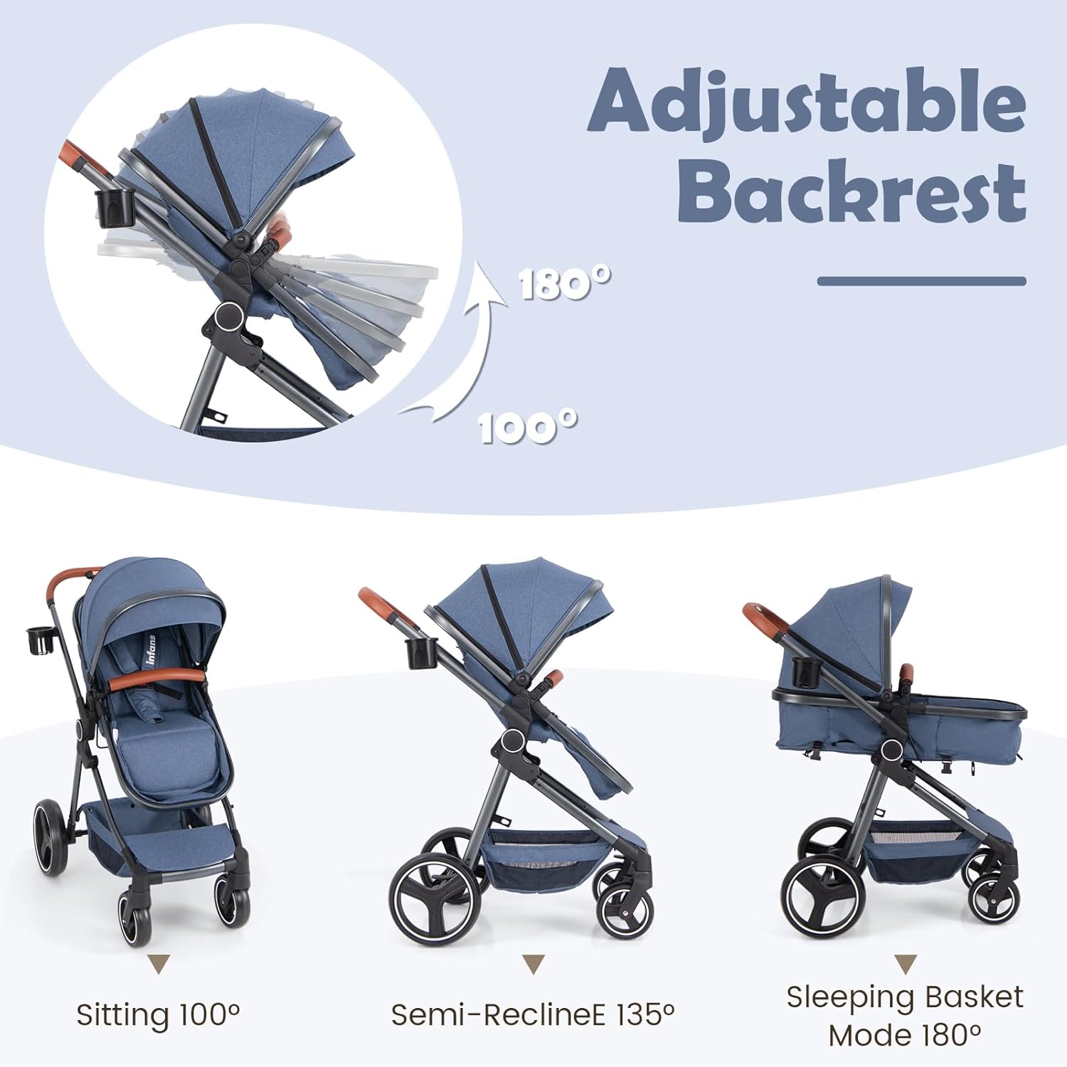 Adjustable Canopy & Backrest: INFANS convertible stroller you can adjust the height of the seat according to your preferences, adjust to a comfortable Angle for baby to rest. By adjusting the back, the baby bassinet can be divided into 3 modes: sitting, semi-reclining or sleeping mode, to meet the different needs of the baby. 3-stage canopy design, can be adjusted according to different weather conditions, well prevent strong sunlight for the baby to provide the best rest environment.