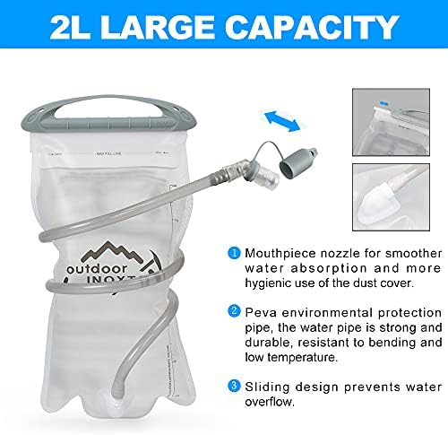 【2L Hydration Bladder 】◕‿ ◕:The 2 liter hydration water bladder can fill water and ice super quickly, it is more convenient to clean no matter when the water temperature is range -20~+50℃.the water tube (40″length,0.4″diameter) provides a healthy flow for easy drinking.