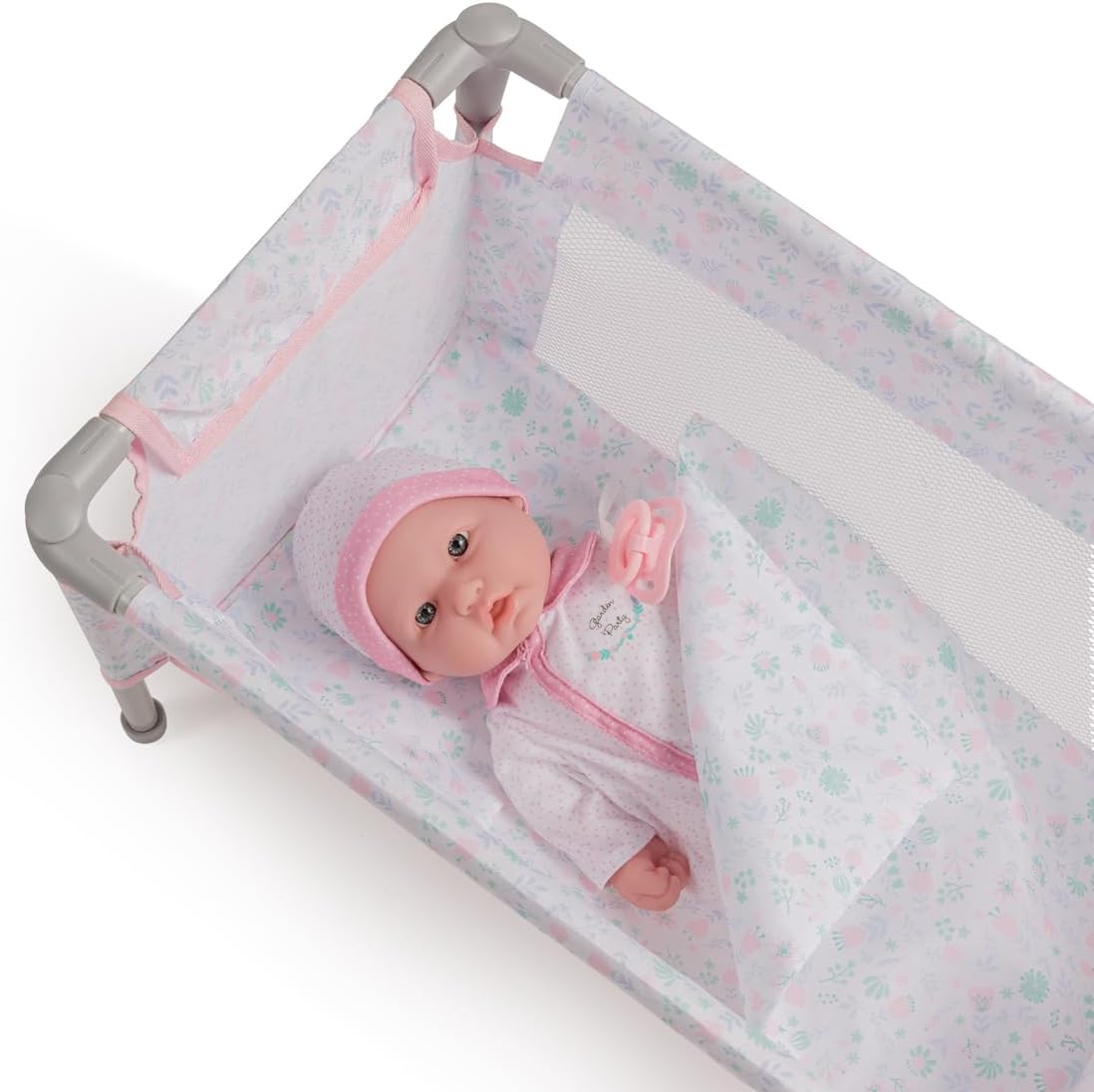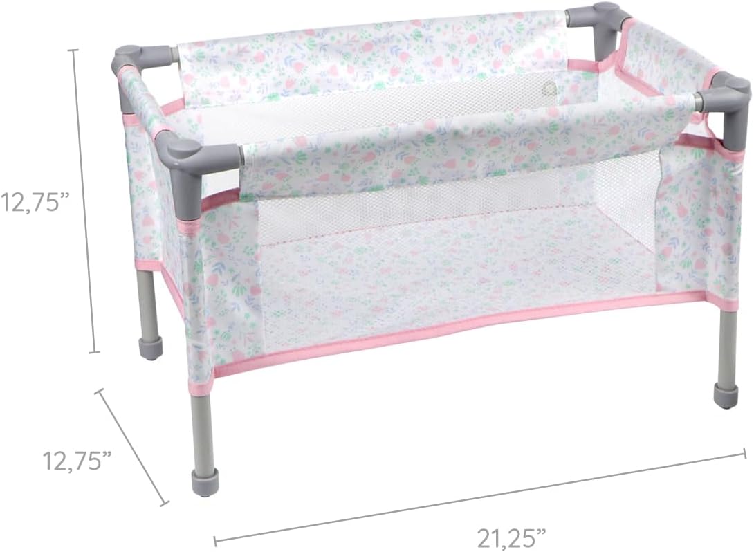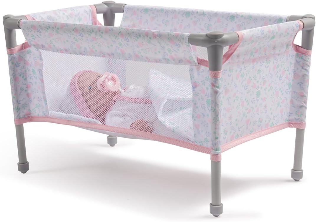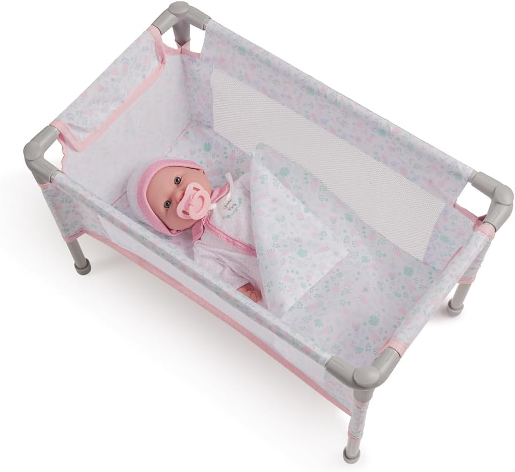 JC Toys – Berenguer Boutique | Travel Folding Crib – Playpen with Accessories | Pink Floral Collection | for Dolls up to 18″ | Ages 3+