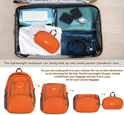 【Large Capacity & Multi Compartment】This foldable backpack with several pockets for storage and organization. The packable daypack has a roomy main waterproof compartment, two front zipper pockets to hold small accessories, one internal zippered security pocket for valuable items and two side pockets for water bottles or umbrellas, helping you easily organize all your essential items.