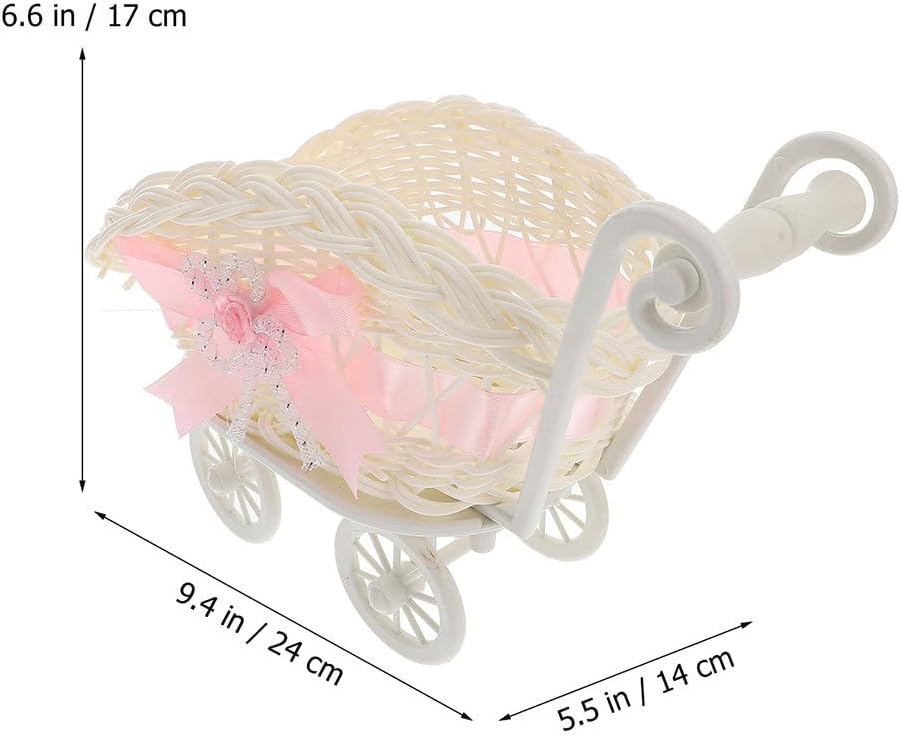 Wicker stroller decoration rattan carriage doll stroller woven flower basket shower centerpiece stroller for shower party favors; this cart shape storage basket can be applied for storing candies, small gifts, snacks, foods, sundries, etc.