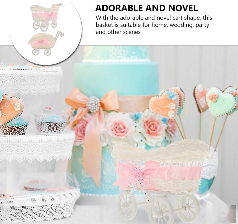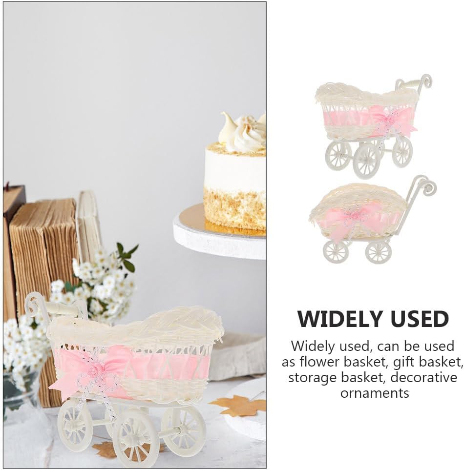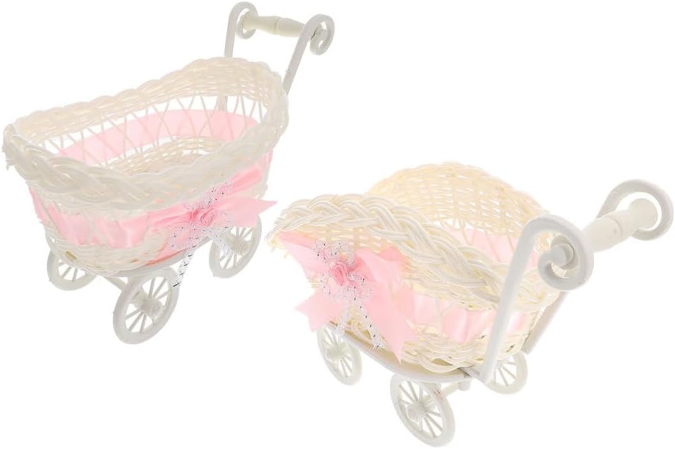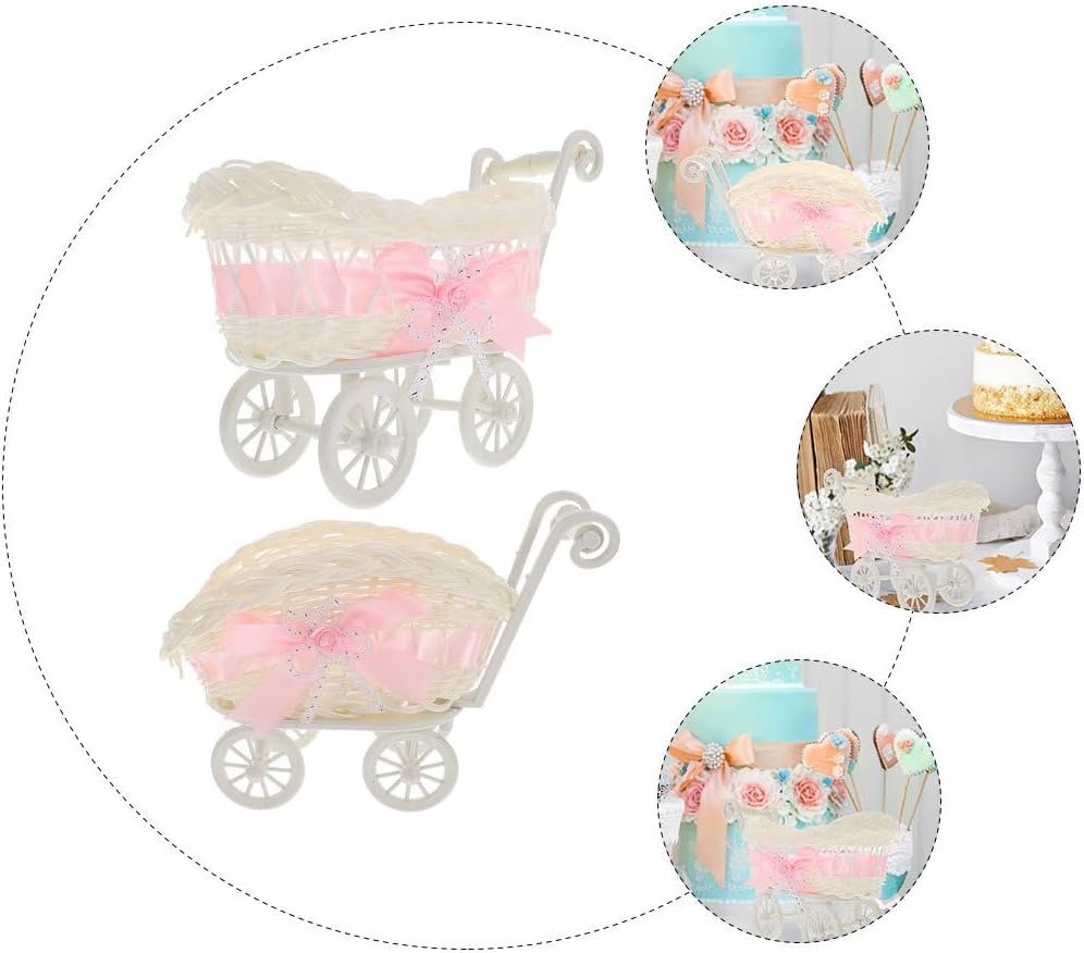 2 Pcs Wicker Stroller Decoration Rattan Carriage Doll Stroller Woven Flower Basket Shower Centerpiece Stroller for Shower Party Favors Pink