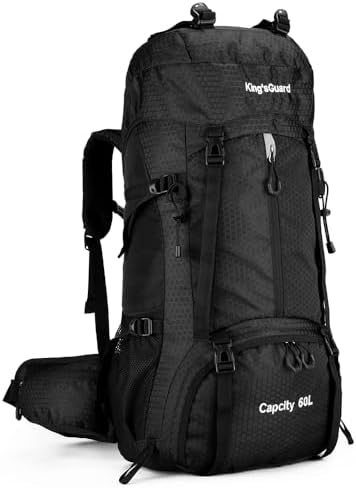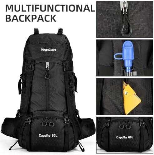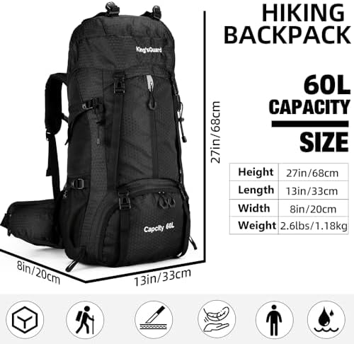 60L Hiking Backpack: The dimensions of hiking daypack is 26.78*13*7.9 inch, generous main compartments designed by drawstring large opening, bottom separate shoe warehouse, 60L room suitable for 2 to 3 days of hiking or camping.