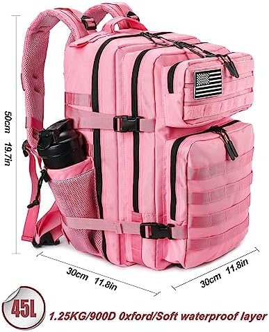 1. Military Tactical backpack size approx: 12inch x 20inch x 12inch, Capacity: 45L; Military backpack is made of 900 oxford nylon fabric, durable and water-resistant. Suitable for fitness, travel, hiking, camping, and other outdoor activities.