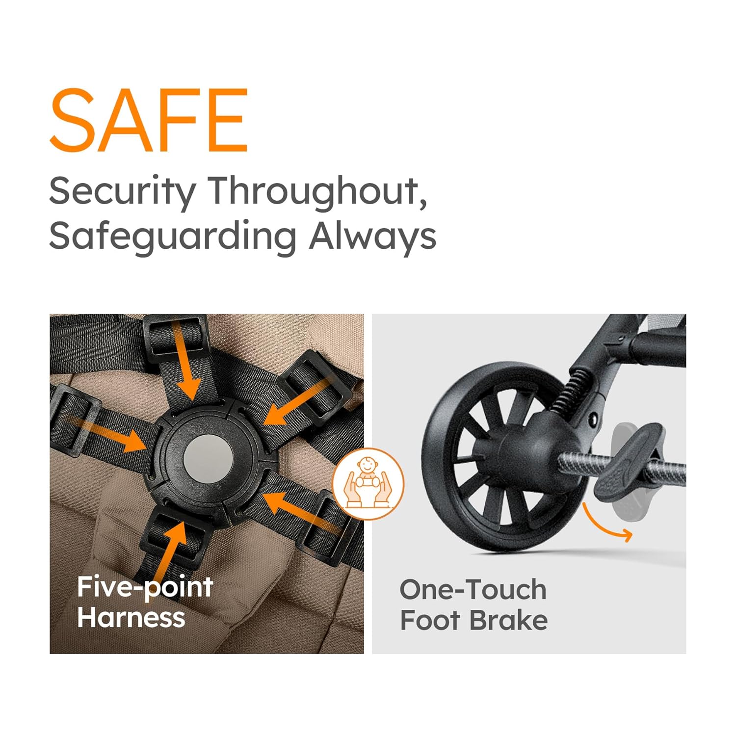 Certified and Safety: Mamazing foldable stroller exceeds CPSC and ASTM standards with OEKO-TEX fabric safety certifications, ensuring a safe environment for your baby. It features a foot-operated brake for quick stops, adjustable 5-point harness, and shoulder straps for growing children. The EVA shock-absorbing tires with all-wheel suspension provide a smooth ride for your baby.