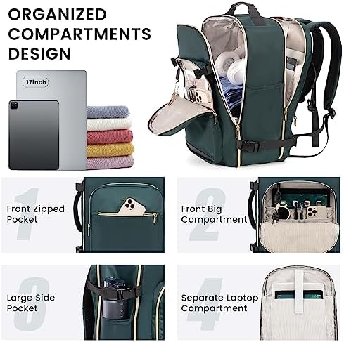 🧳【40L LARGE CAPACITY】Our travel backpacks enable you to pack all your travel essentials for a 3-5 day travel, which can hold 3-5 days’ clothing, a pair of shoes, your wallets, toiletries, a 17.3” laptop, a 12.9” iPad and so on. The side straps can also help you compress the pack when it is too full.