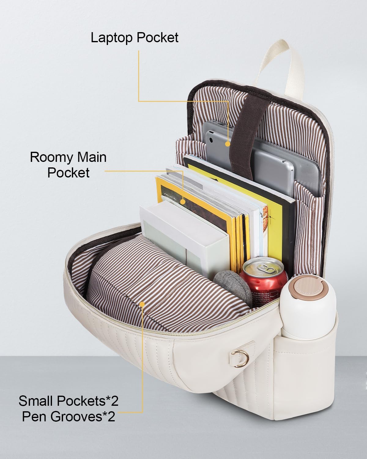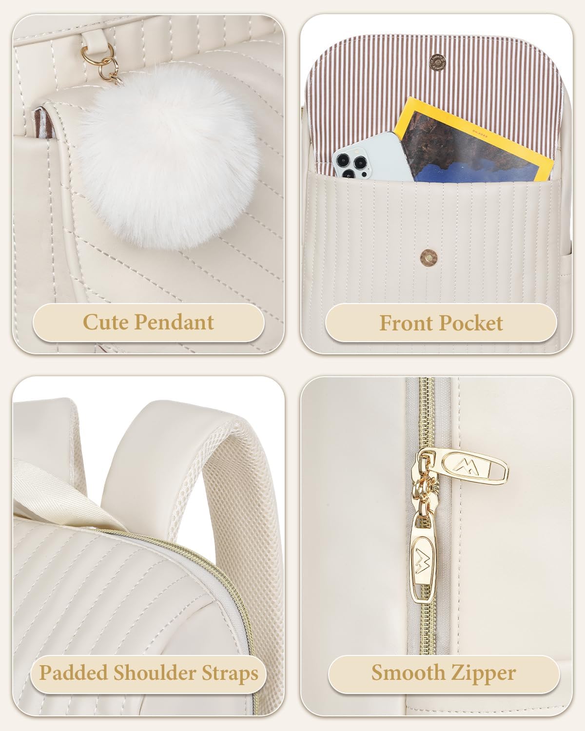 🎁PU Vegan Leather: This laptop backpack for women is made of water-resistant PU leather with reinforced quilted stitching, bright gold hardware, sturdy polyester lining. Delicate pendant designed for fashion appearance and padded shoulder straps for comfortable. Please note that the detachable long shoulder strap is made of canvas