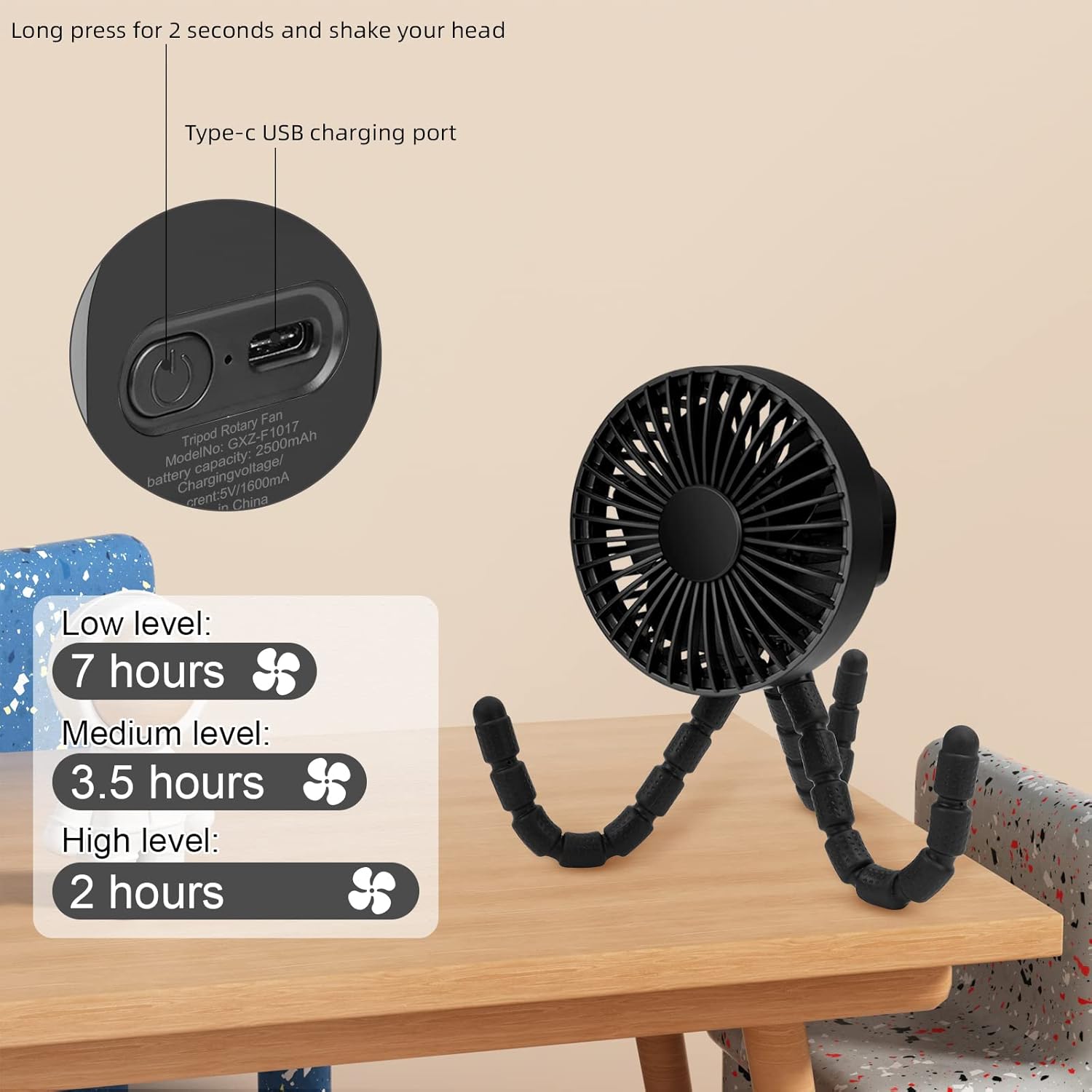 Stroller Fan clip on for Baby car Seat fan handheld 120 °rotate shake head USB rechargeable 3 Speeds flexible tripod mini Fan comes with 2500mah battery, lasts 3-10 hours depending on winds, support USB charging via power bank laptop and any power source with USB output,a must have for you and your kids trip to Disneyland, zoo and park