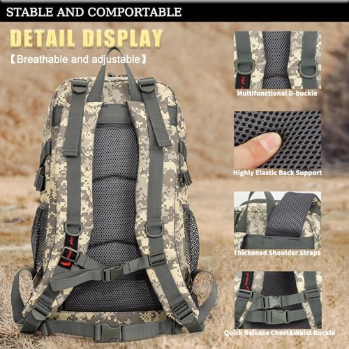 SIZE AND MATERIAL:8.6″*18.8″*11.8″ / 22*48*30CM (W*H*D),Capacity: 30L. The camo backpack for boys is made of 600D polyester with water-resistant coating, durable and waterproof material ensure this small tactical backpack men have a longer life