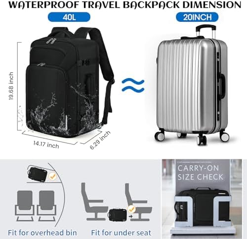 Flight Approved Travel Backpack➤ Size of this travel laptop backpack: 14.17*6.29*19.68 inches. The 40L carry on backpack meets the maximum allowed size for carry on luggage on most flights, it can be fitted overhead bin and under-seat, helping you to save extra baggage fees. The TSA 180 degree zipper closure design of the laptop backpack helps you get through the security check quickly, with built-in elastic bands prevent your laptop from dropping.