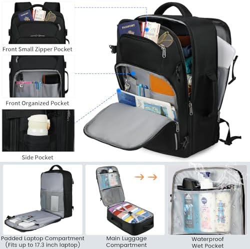 Roomy & Well Organized➤ Roomy travel backpack features 5 compartment and 1 elastic side pocket. One back pocket. A large main compartment can store 5 to 8 clothes, shoes, books, etc. A separate wet zip pocket for toiletries, and a mesh pocket for dry items. A laptop compartment with tablet pocket holds up to 17.3 inches laptop and 9.7 inches tablet. A front large pocket with detachable key ring and various small pockets for pens, keys and A4 folder. A front small front pocket for quick access.