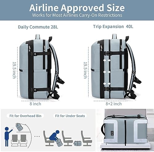 【Spacious Capacity and Expandable】Our large travel backpackcomes with an expandable feature from 28L to 40L packing capacity for 3-7 days of travel essentials. Demension:19.5*10 *8. Simply unzip for additional storage, the main compartment can effortlessly accommodate the packing cubes and other travel essentials.