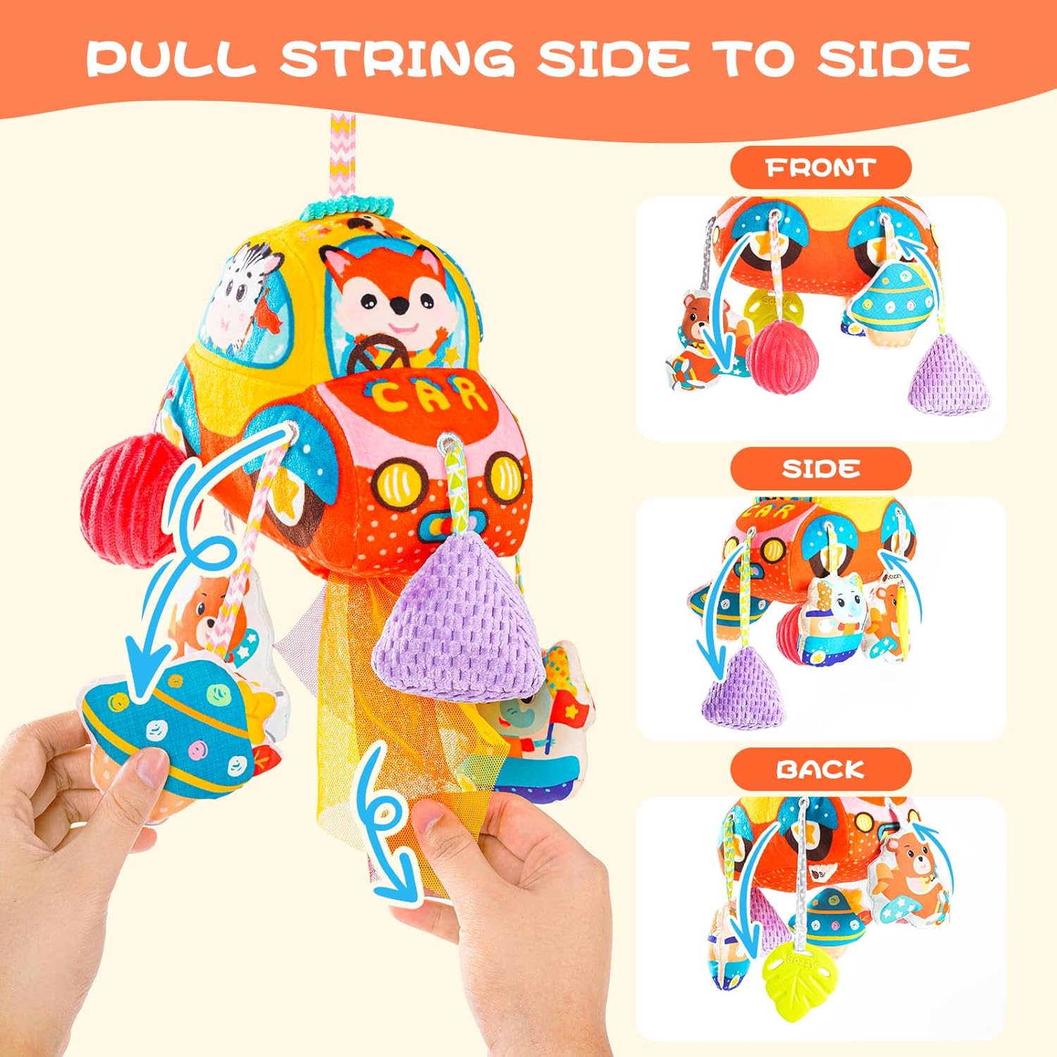 Plush Material: Our car seat toy for newborns is made from soft velour fabric and the soft plush material gives your baby a soft and cosy touch. The toy also has a mirror on the side for added fun. This pull string Montessori toys has high contrast colour and many different textures to give your baby the maximum sensory experience.The colour and patterns help to focus attention, beneficial for babies over 3 months, when they actually start to seeing colors. These are great toys for developing babies’ tactile, visual and listening skills