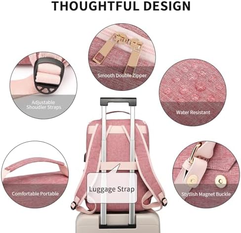 Functional & Safe: pink backpack women with a luggage strap for easy carrying on luggage/suitcases, two external elasticized pockets on both sides for water bottles and umbrellas, and a safe and secure pocket for your valuables, this pink backpack women is functional and safe for your daily commuting needs.