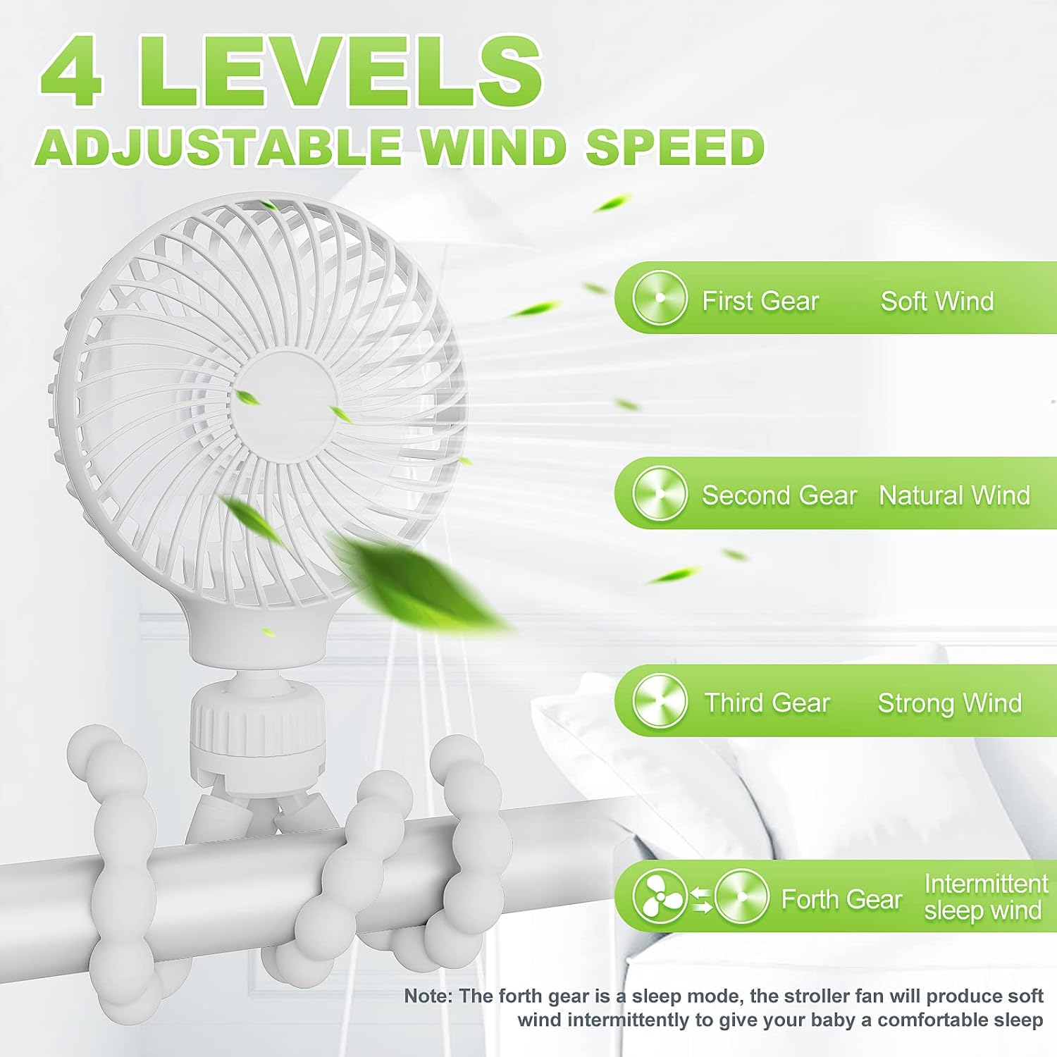 【Super Quiet Design】This baby stroller fan has 4 wind speeds which can be switched easily by pressing the button on the back of the fan head. The breeze can better care for your baby’s health, and the forth gear is a sleep mode, the mini baby stroller fan will produce soft wind intermittently to give your baby a comfortable sleep.