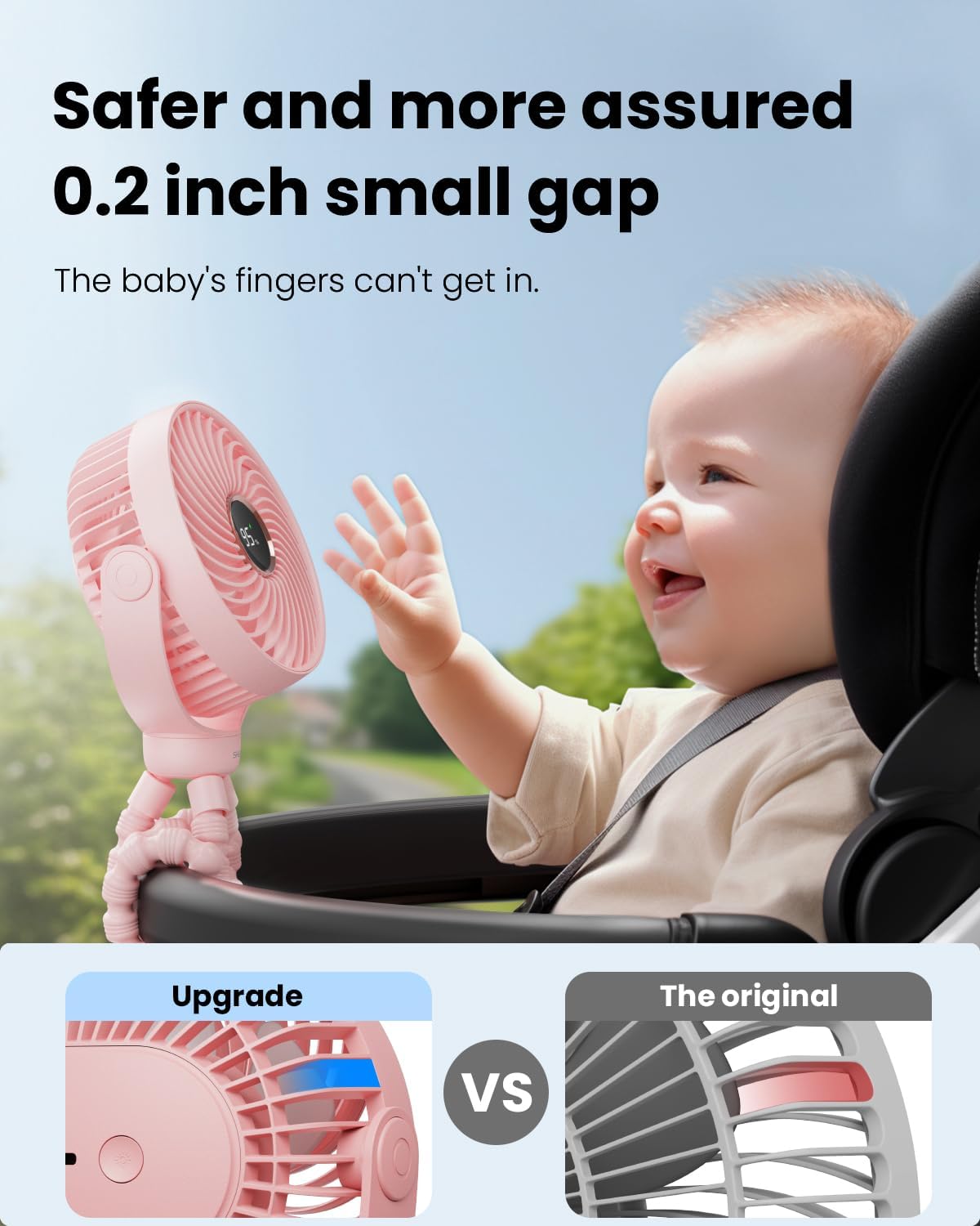 LED Display & Night Light: The stroller fan features an LED display showing the operating gear and remaining power. Additionally, the mini baby fan includes a 3-level brightness night light