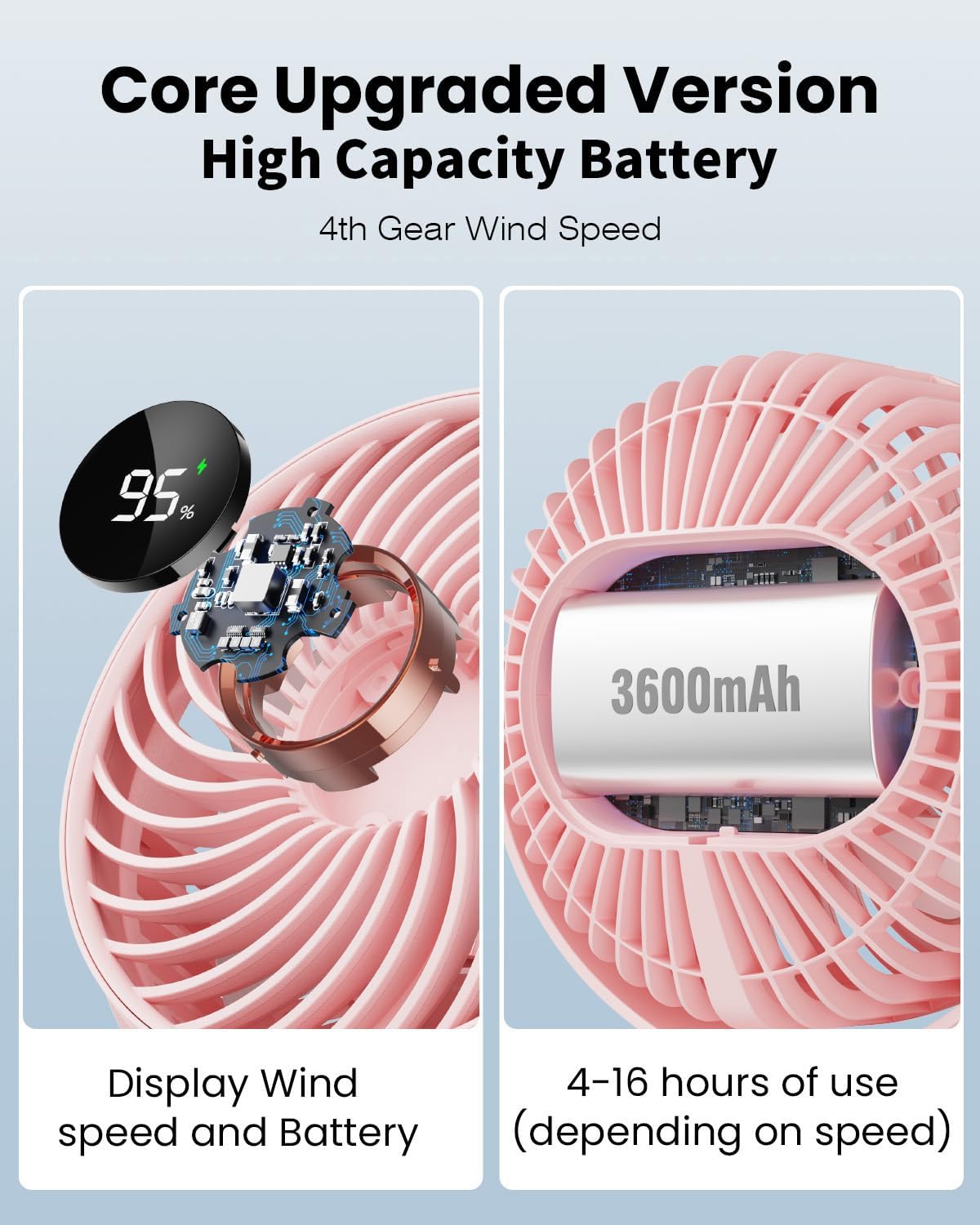 Extended Battery Life: Powered by a 3600mAh rechargeable battery, this portable fan requires 3.5 hours for a full charge and can operate for 4 to 16 hours, depending on the speed