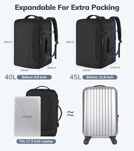 ✨【LARGE CAPACITY & MULTI-COMPARTMENT】:TOTWO large backpack for travel can reach a maximum capacity of 45L, which is large enough to meet most people’s daily travel needs. The travel backpack carry on also offers plenty of space for organizing pens, textbooks, wallet, clothes, shoes, bottles, and more, and a separate computer compartment for a 17.3-inch computer.