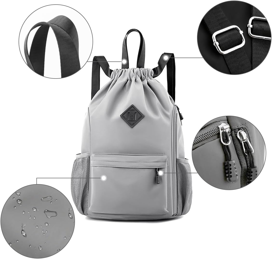 Multi-Pocket Design: The drawstring backpack is designed with multiple pockets to store different items. There is 1 main pocket, 1 wet pocket, 2 side mesh pockets, 1 back side pocket and 1 shoe compartment.
