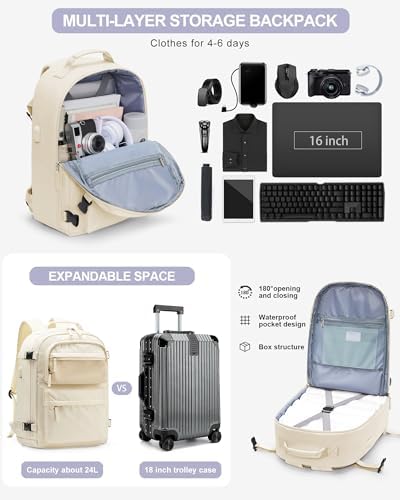 Approved for most flights:External dimensions are 18.5*6.3*12.5inch(H × W × D)Upgraded dimensions are 12.5*6.7*18.5inch(L*W*H),Weight 2 lbs. This backpack meets the boarding requirements, can be opened and folded 180 degrees like a suitcase, can quickly pass through airport security, designed for air travel. It has a luggage strap on the back so you can carry the bag on your suitcase without having to carry a heavy bag all the time.