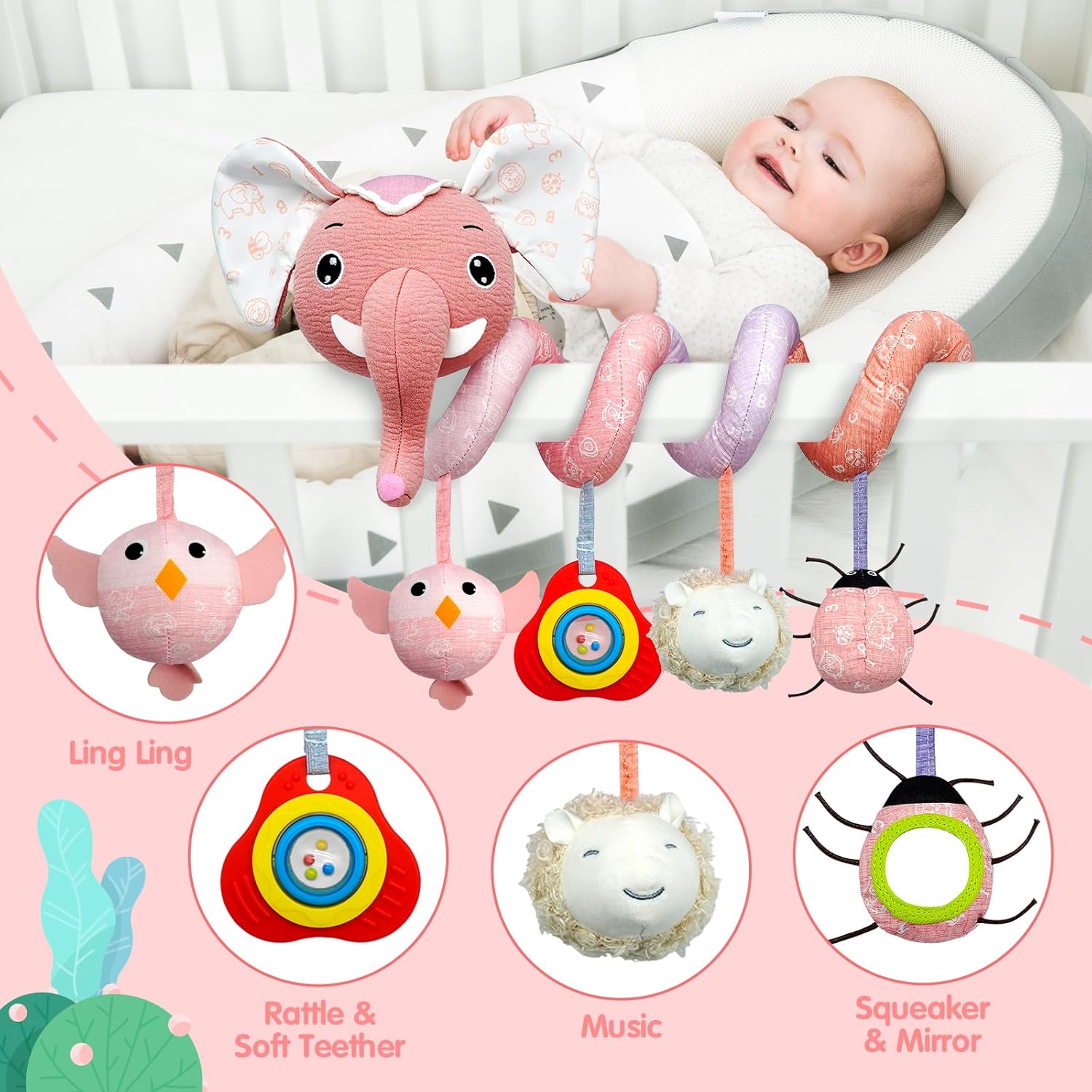 [Spiral Activity Sensory Toys]: This is a baby toy designed for newborns, which is soft and can be wrapped around car seat handles, baby stroller rails, bassinets, or cribs. the baby toys 0-3 months is particularly suitable for entertainment at home or on the go, your baby will play and explore for hours of interaction with carseat toys for infants 0-6 months, newborn toys 0-3 months can calm the baby’s emotions when the baby going out, helping him to quickly adapt to unfamiliar environments